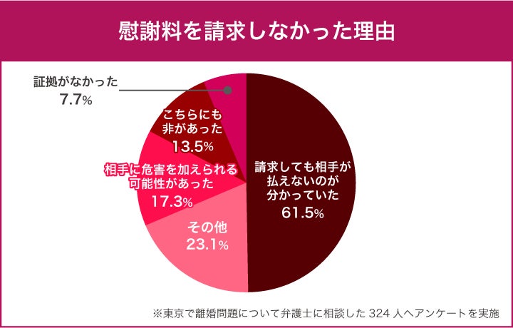 慰謝料請求をしなかった理由で半数以上の61.5%を占めていたのは、「請求しても相手が払えないのが分かっていた」です。実際に、慰謝料請求が認められたにもかかわらず相手がお金がなく回収できないトラブルはいくつも存在します。