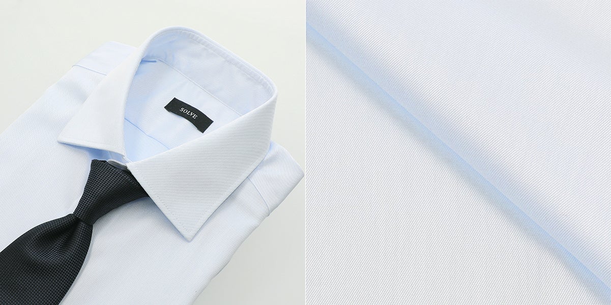 100番手双糸を使った、きめ細やかで繊細な綿100%の生地にアイロンがけが不要になる形態安定加工と、エリやカフスの皮脂や、コーヒーなどの汚れがつきにくい防汚撥水加工を施しました。 家事が楽で、着心地がよいだけではなく、きれいなまま長く使っていただけるオーダーシャツです。