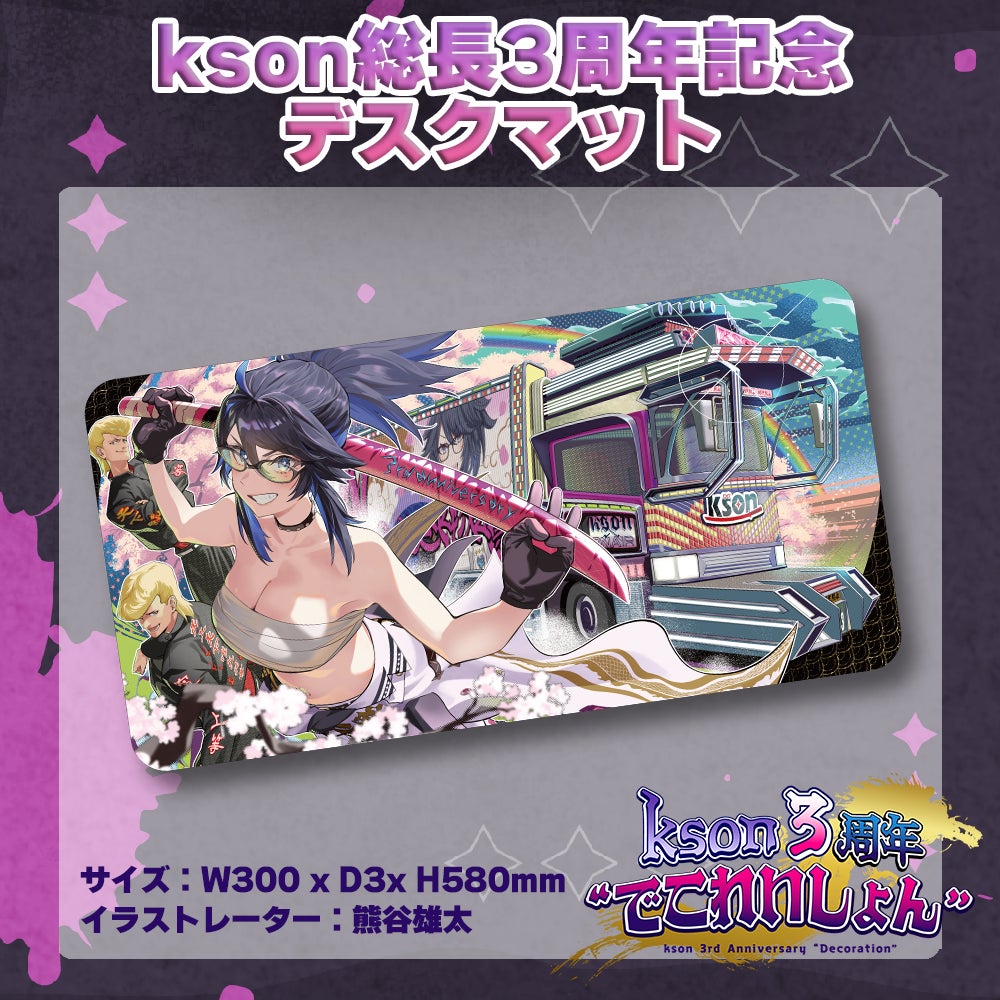 今までのLive3Dコンサートスタイルとは違うデコトラスタイルで行われ、豪華スペシャルゲストも登場しました。3周年記念グッズでは、配信でKsonが乗っていたデコトラがデザインされたデスクマットなどが販売されました。