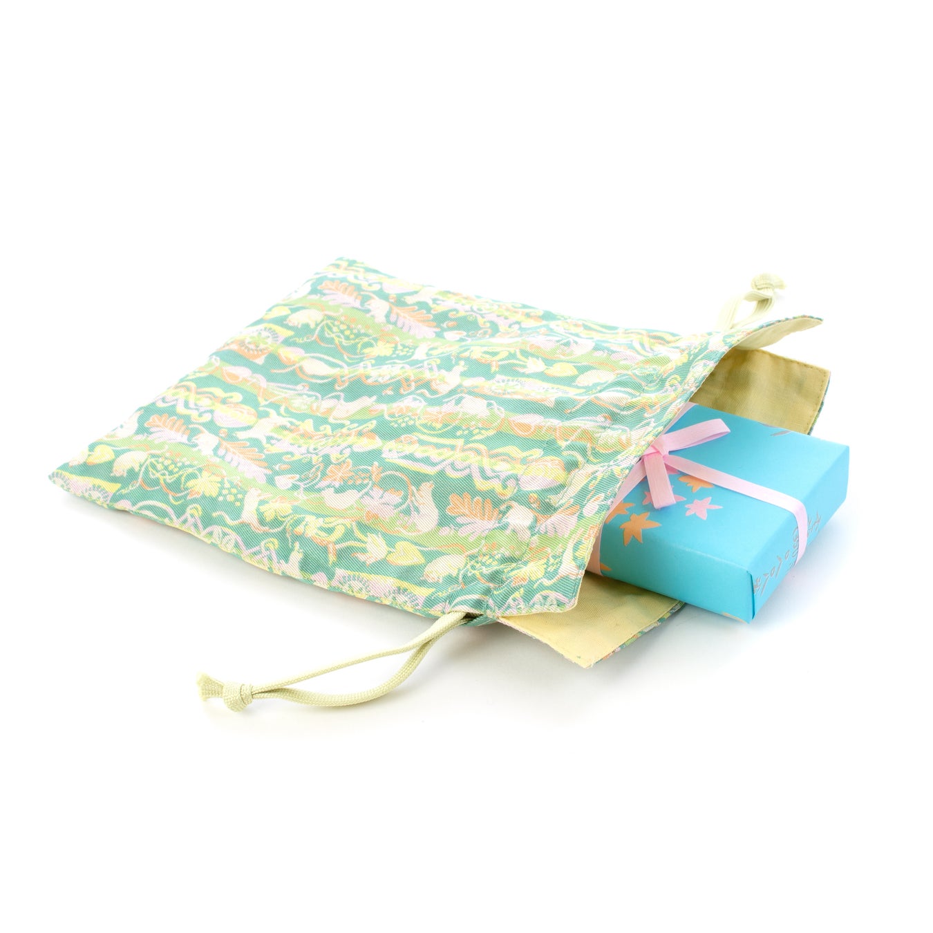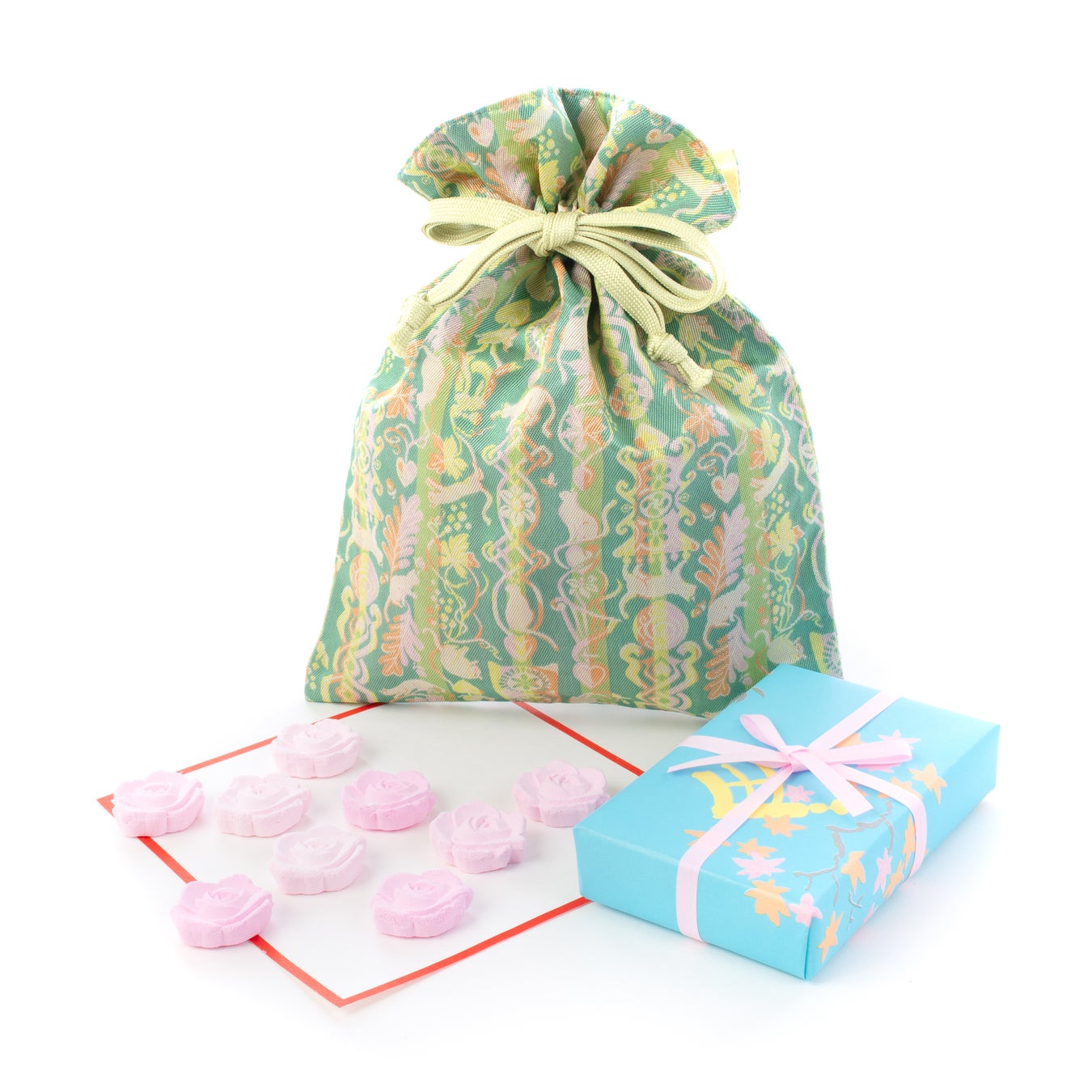 『春びより』は、龍村美術織物の人気柄「匙飾りの猫(さじかざりのねこ)」を使ったオリジナルの巾着に、和三盆を使用した末富のお干菓子をお入れした数量限定商品となっております。グリーンを基調とした鮮やかな色合いの絹織物と、ピンクのグラデーションがかわいい薔薇の花の干菓子が、春の訪れを喜び、祝う、そんな楽しい雰囲気を演出します。