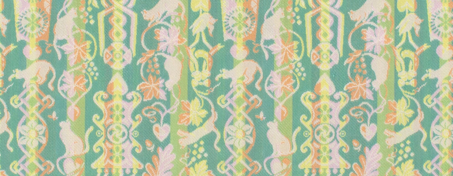 愛らしい猫と一緒に文様全体を探検するような気持ちで親しんでいただきたい経錦です。