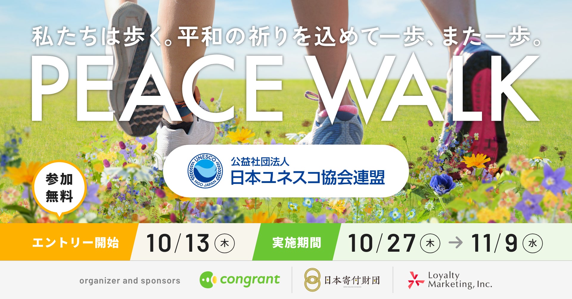 公益社団法人日本ユネスコ協会連盟(東京都渋谷区 会長:佐藤美樹)は、コングラント株式会社が主催するオンライン参加型チャリティウォーク企画「PEACE WALK」の寄付先団体の一つとして選ばれました。