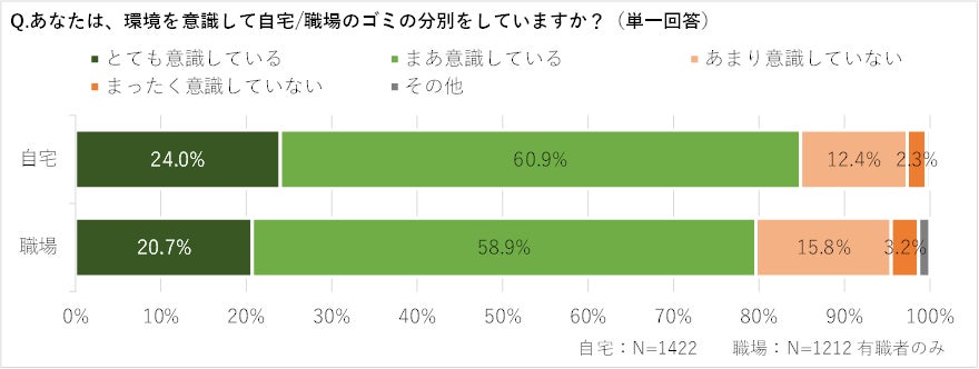 職場・自宅ともに、約8割が食事ゴミは環境を意識して分別していると回答
