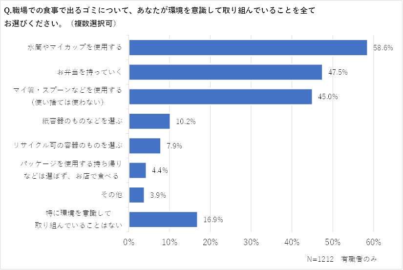 ・職場の食事で出るゴミ削減への取り組みは「水筒やマイカップ」「お弁当持参」「マイ箸・マイスプーン」
