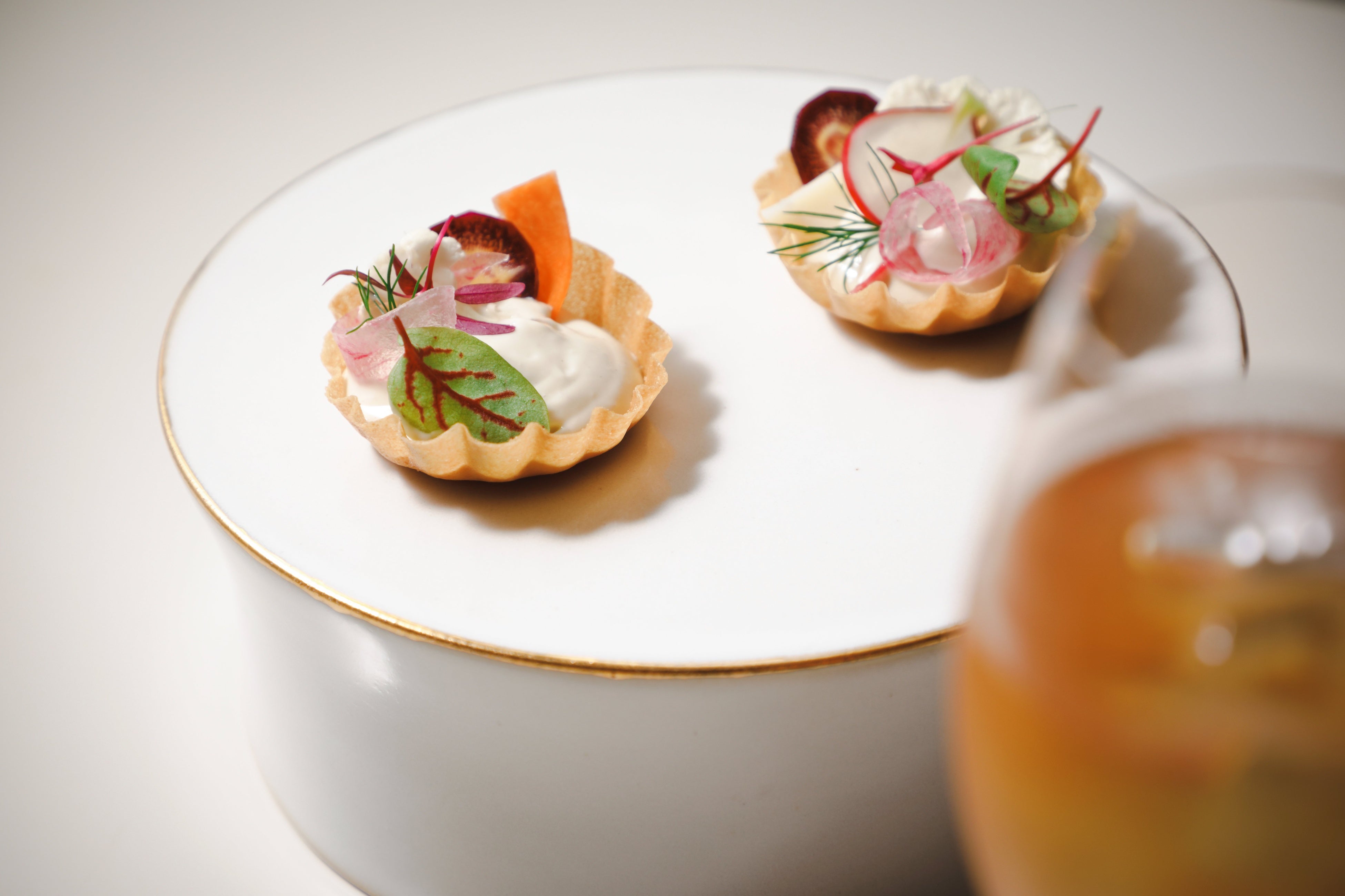 アミューズには、蕪や百合根などの冬野菜を合わせた滑らかな豆腐フムスのタルトを。ソムリエが厳選したウェルカムティーとご一緒に、あとに続くコースの上質なペアリングを予感させる最初の一品をお楽しください。