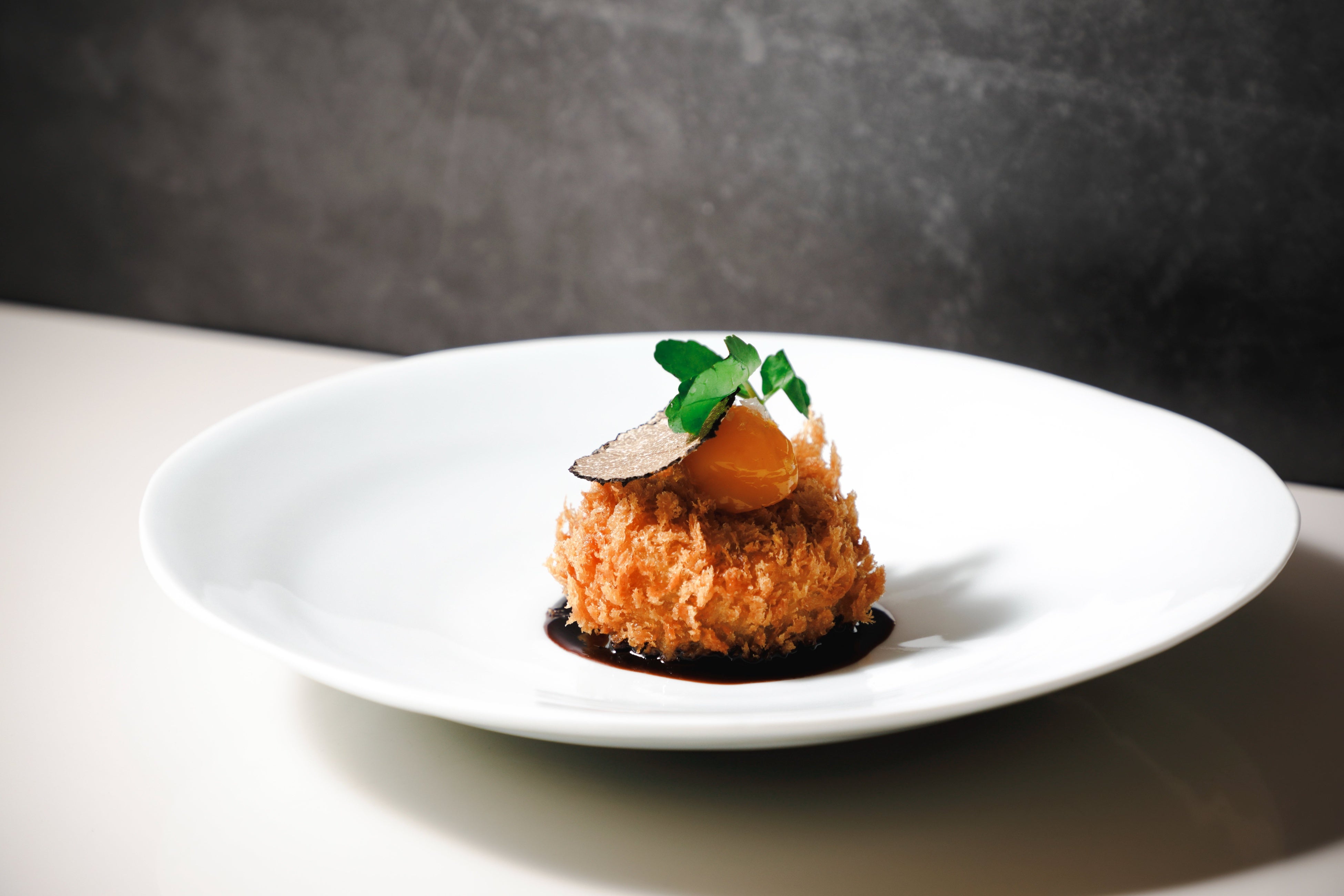 メインに見立てた近江牛100%のメンチカツと卵黄のコンフィと合わせ、フレッシュなトリュフを添えた一品。濃厚な赤ワインソースとともに。