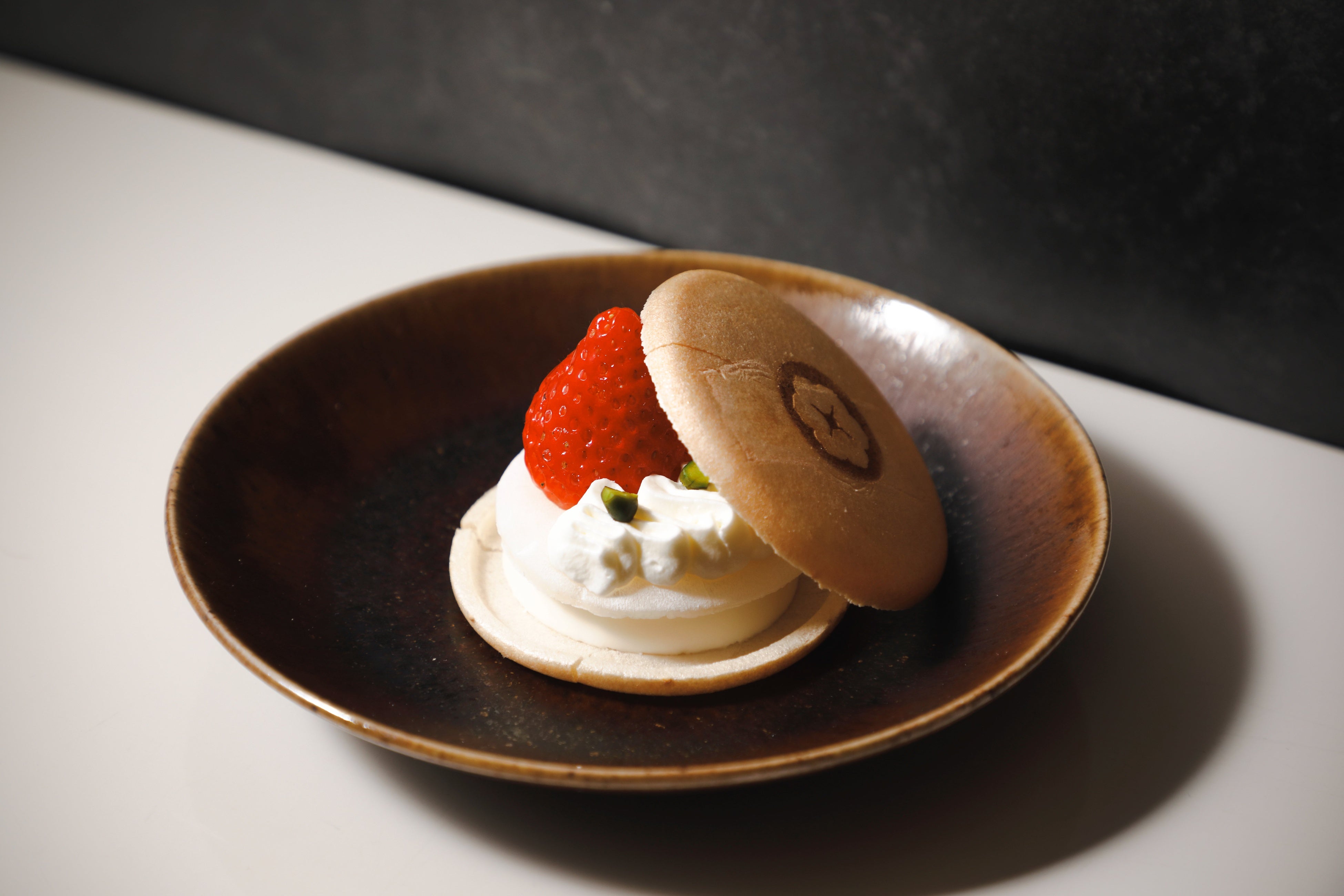 京都府南部、久御山産の“あざといちご”を自家製の求肥と合わせました。濃厚なミルクアイスクリームをあわせたアイス最中です。