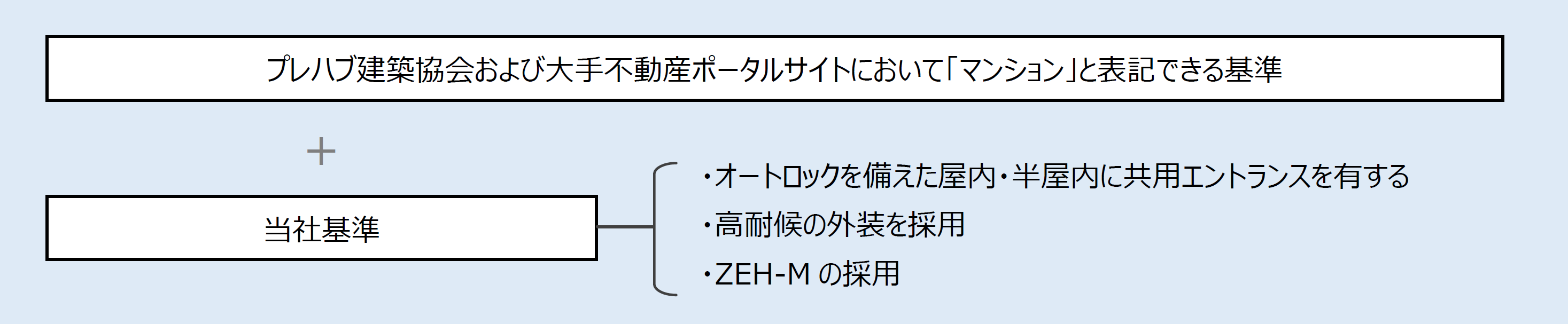 ミサワホームでは、一般社団法人プレハブ建築協会や大手不動産ポータルサイトにおいて「マンション」と表記できる基準に、当社独自の基準を加えた下記条件を満たす賃貸住宅を「Belle Lead MANSION」としています。