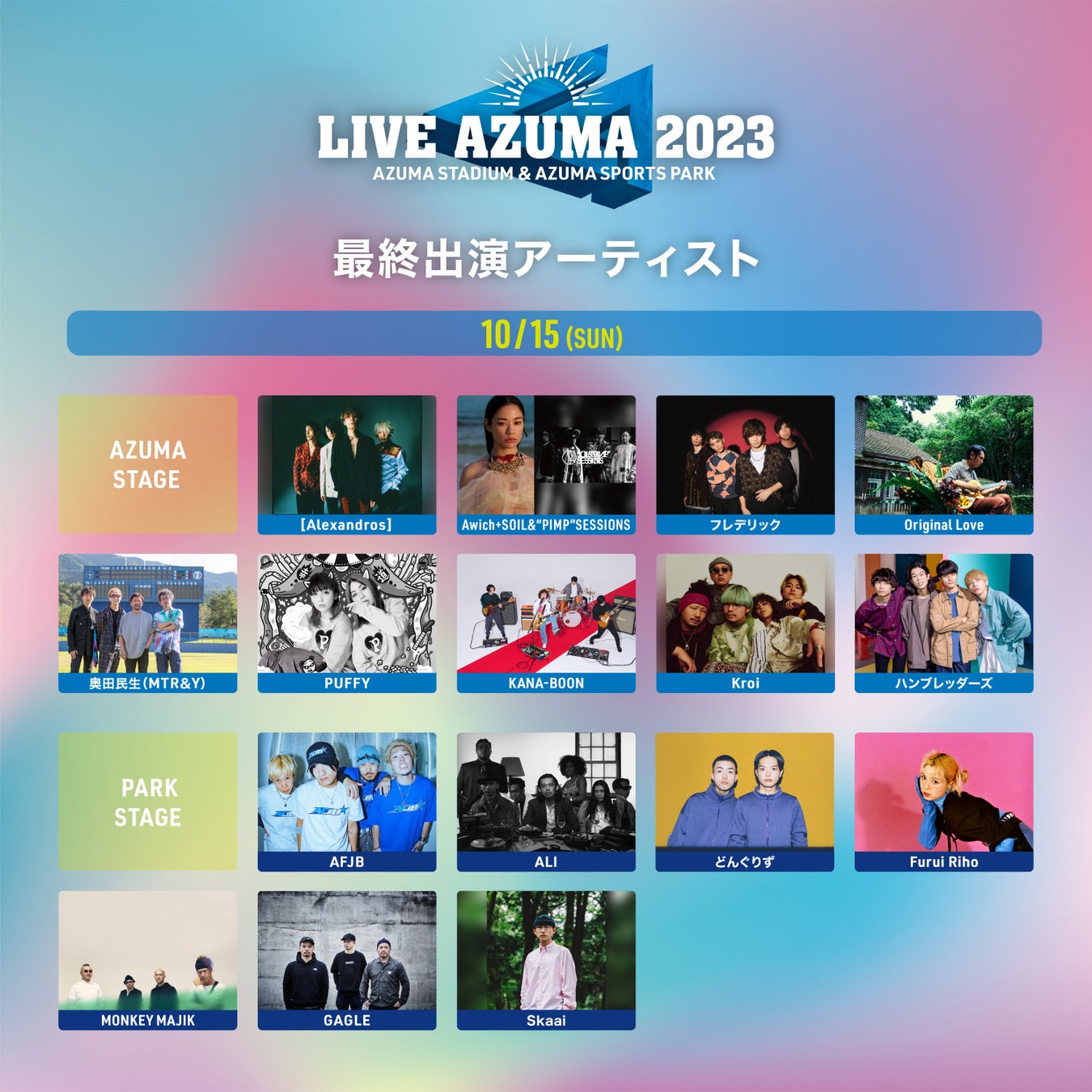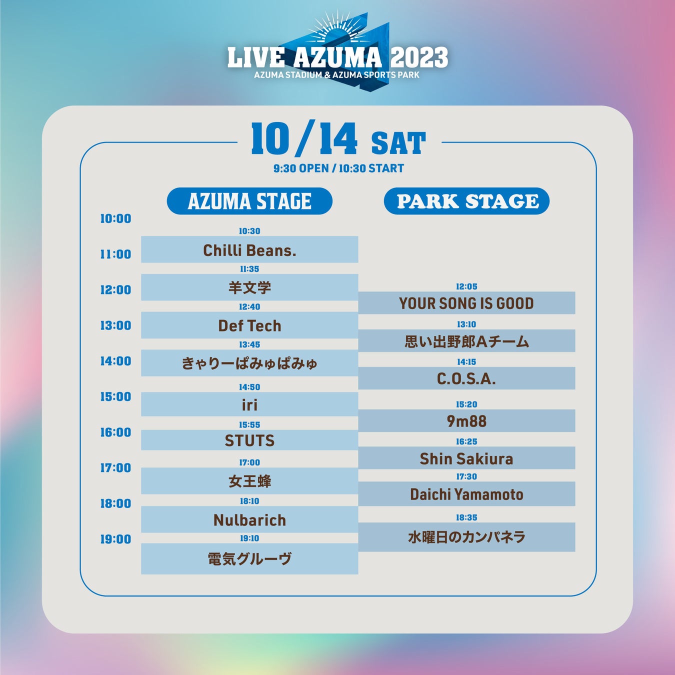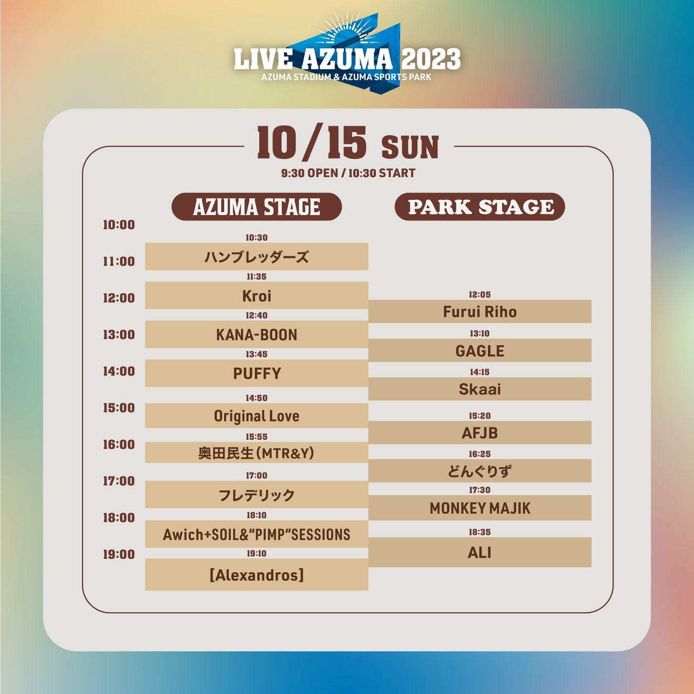 それと同時に各日程のタイムテーブルも公開しました。オープンからラストまで、AZUMA STAGEもPARK STAGEも一瞬の隙も許さない充実のラインナップになっています。