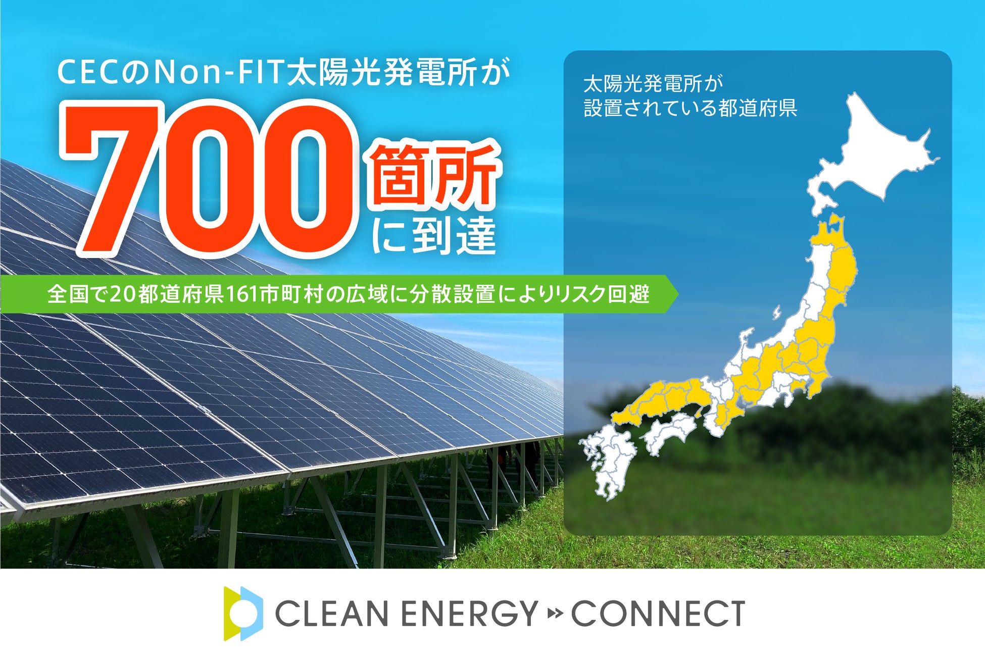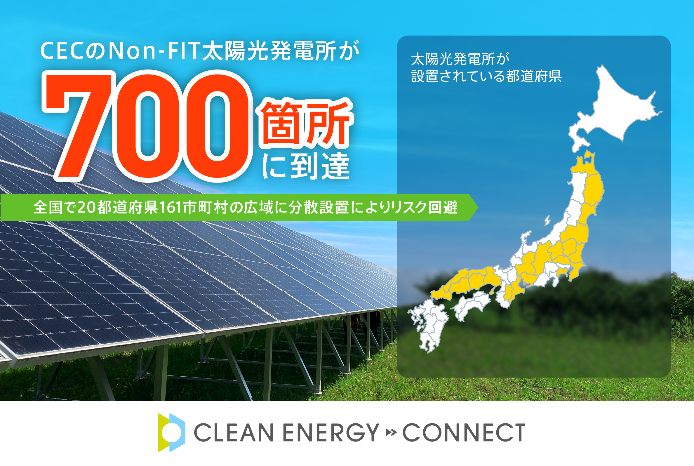脱炭素経営企業、RE100参加企業等のお客様に対してNon-FIT太陽光発電によるグリーン電力と環境価値をお届けする株式会社クリーンエナジーコネクト(代表取締役:内田鉄平、以下「クリーンエナジーコネクト」)は、発電を行っているNon-FIT太陽光発電所が、合計700箇所になりましたのでお知らせします。