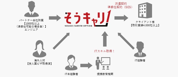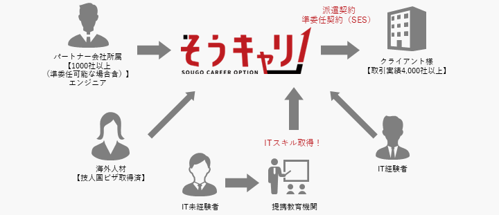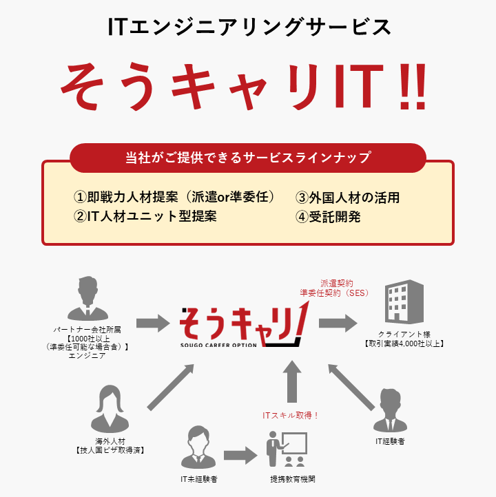 「そうキャリIT!」は、総合人材会社である綜合キャリアオプションが、ITエンジニアを求めるクライアントに対し、様々な専門スキルを持つ豊富な人材から、クライアントの要望に合わせた最適な提案を行うサービスです。