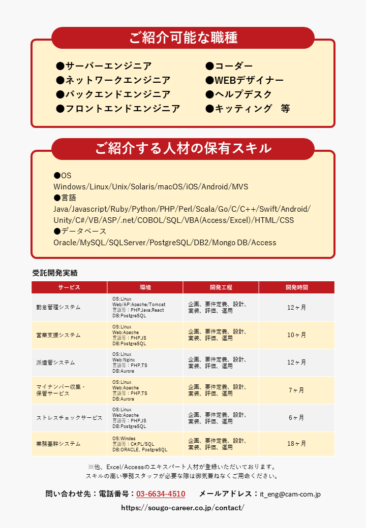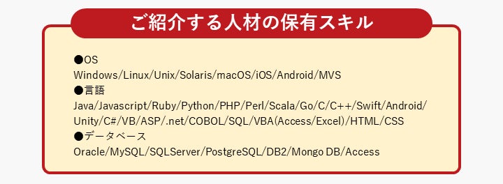 サーバーエンジニアやネットワークエンジニアのほか、WEBデザイナーやヘルプデスクなど、ITにまつわる幅広い人材をクライアントにご紹介するシステムです。