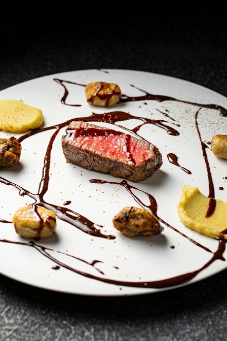 - 和牛テンダーロインのグリル・サツマイモのニョッキ・春菊ベニエ・ビターチョコレート&サンショウソース