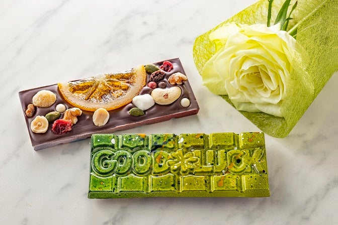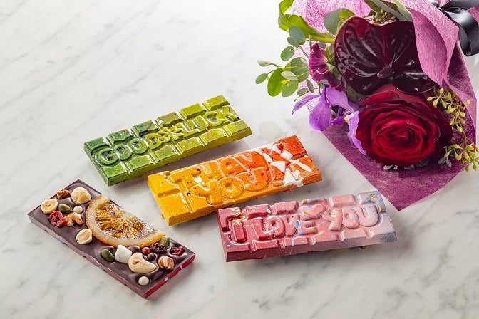 チョコレートは3種のアブストラクトペイント(レッド: I LOVE YOU | イエロー: THANK YOU | グリーン: GOOD LUCK)から、バラはホワイトまたはレッドのお好きな組み合わせをお選びいただけます。