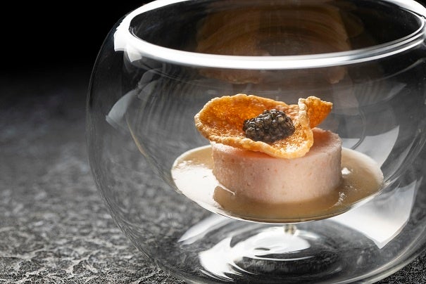 - サステナブル海老のフラン・醤油麹&ホワイトチョコレートソース・キャビア