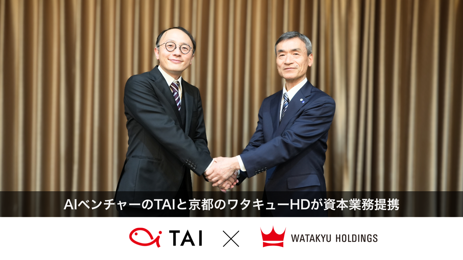 Tokyo Artisan Intelligence株式会社(本社:神奈川県横浜市、代表取締役社長 CEO・CTO :中原 啓貴、以下:「TAI」)は、ワタキューホールディングス株式会社(本社:京都府京都市、代表取締役社長:村田 清和、以下「ワタキューホールディングス」)と資本業務提携したことをお知らせいたします。