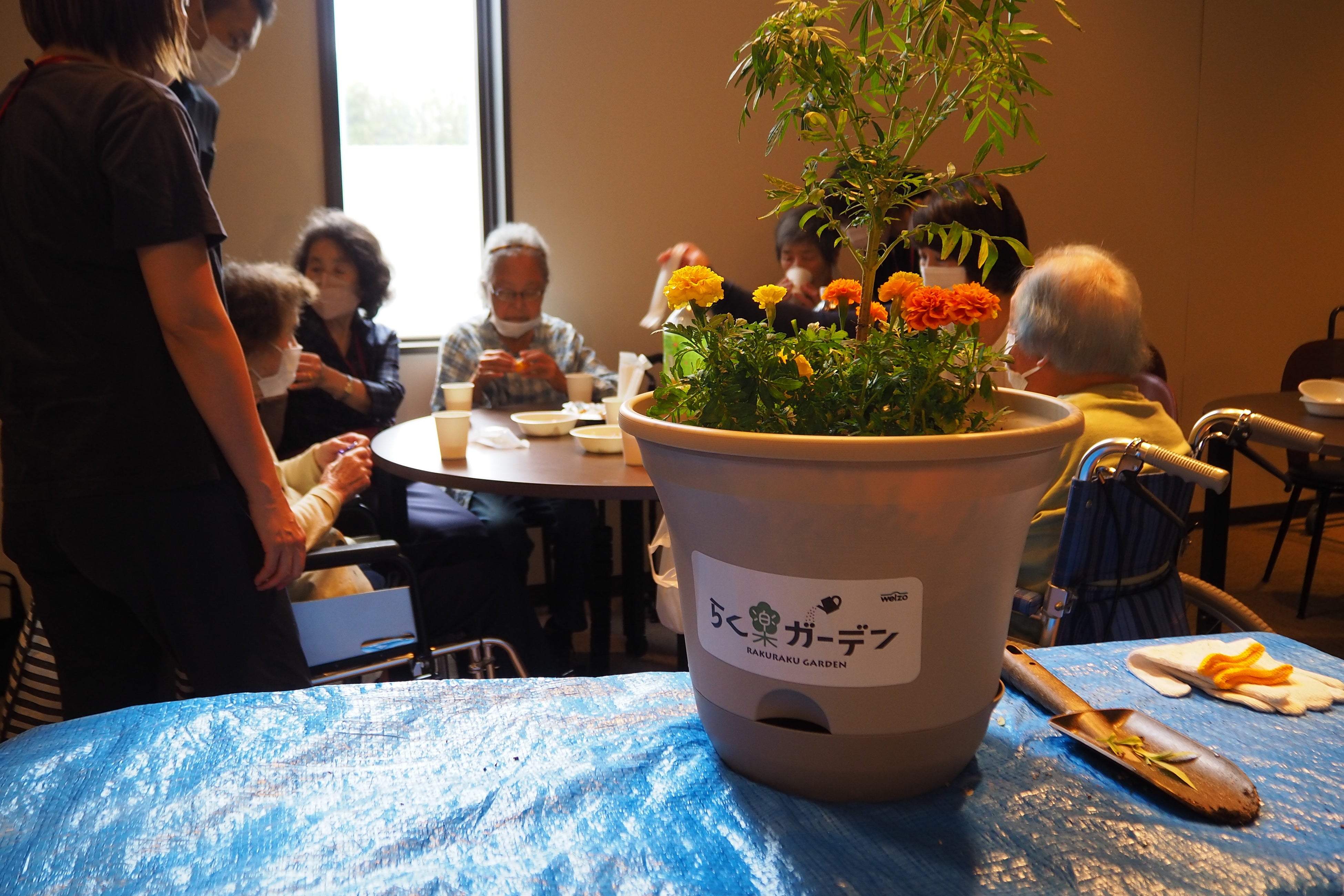 開所前日の9月14日(木)に認知症当事者・家族をはじめ、高齢者施設利用者・介護職員・認知症ライフサポートワー カーなどと一緒に、認知症啓発のシンボルカラーであるオレンジ色の花を咲かせる「マリーゴールド」をプランターに植える活動を行いました。活動中は皆様慣れた手つきで植付作業をし、和気あいあいとした空気の中で実施いたしました。 植付の後は簡単なお菓子とお茶でお茶会を行い、皆様笑顔でお話しされている姿が印象的でした。