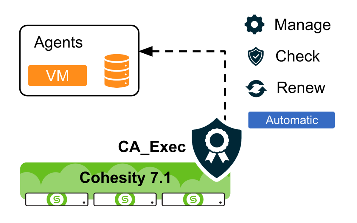 ・Cohesityコンポーネント通信用の新しいネイティブの公開鍵基盤 (PKI) 証明書管理: 7.1リリースでは、CohesityはPKIインフラストラクチャを強化し、Cohesityエージェントとクラスタ間の通信を保護するために使用される証明書を追跡し、自動的に更新できるようになりました。強化により、お客様の環境で使用される証明書のライフサイクルがより管理しやすくなりました。
