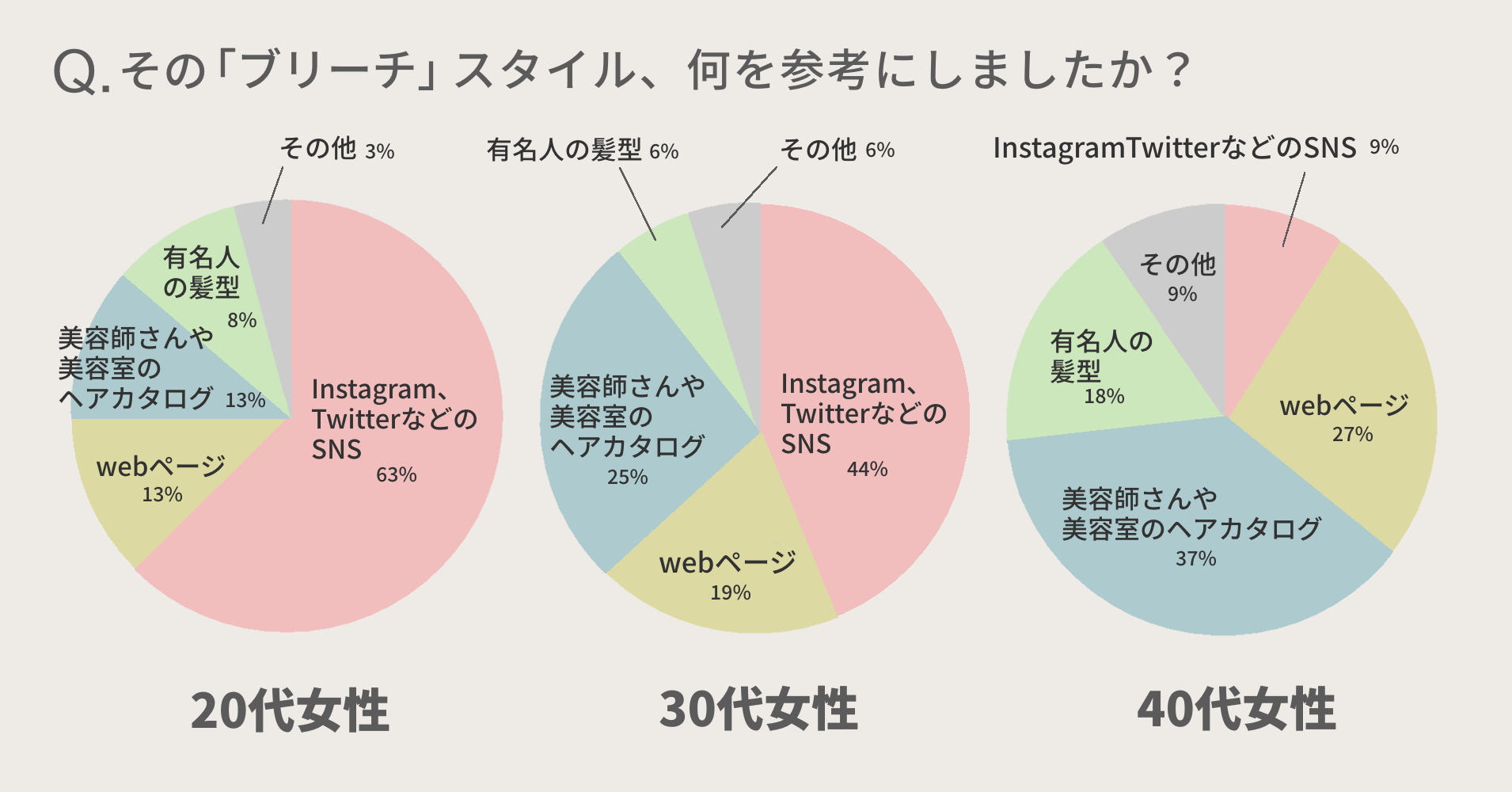 20代、30代は圧倒的に「Instagram、TwitterなどのSNS」が多く、40代でいちばん多いのは「美容師さんや美容室のヘアカタログ」。