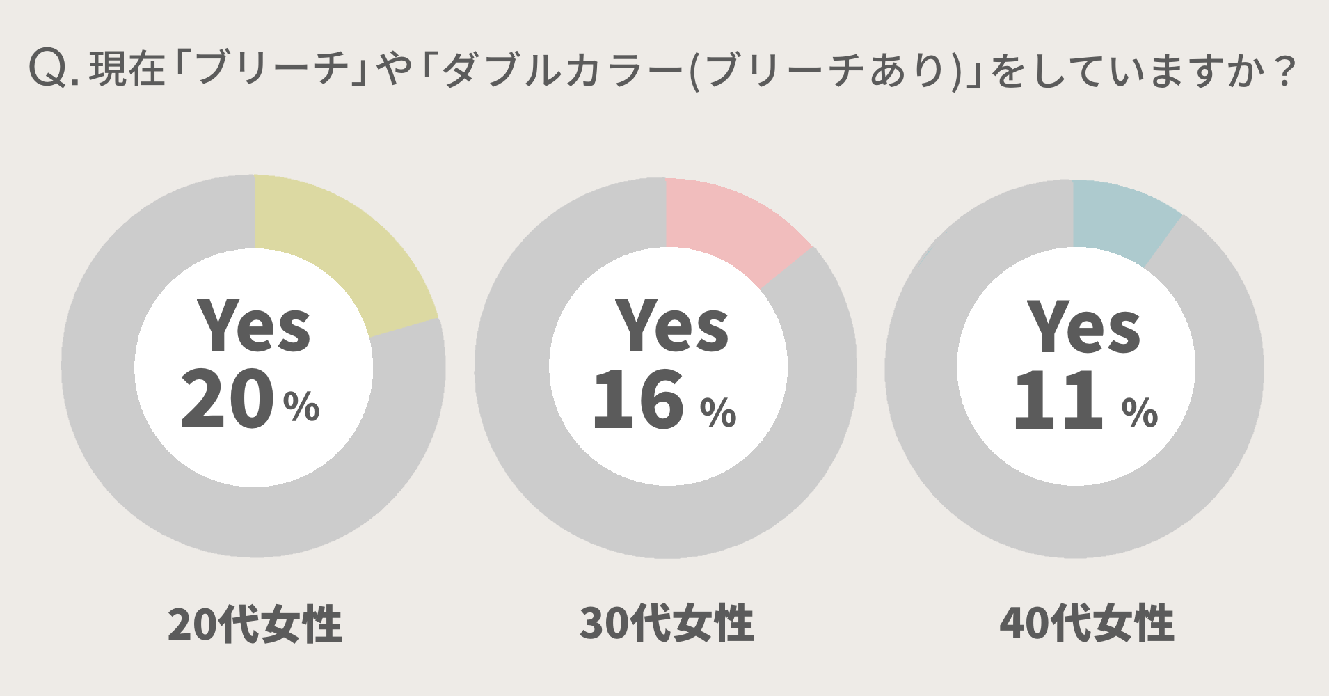 アンケートで「現在ブリーチやダブルカラー(ブリーチあり)をしていますか?」とお尋ねしたところ、「はい」と答えたのは20代が全体の20%、30代が16%、40代は11%でした。