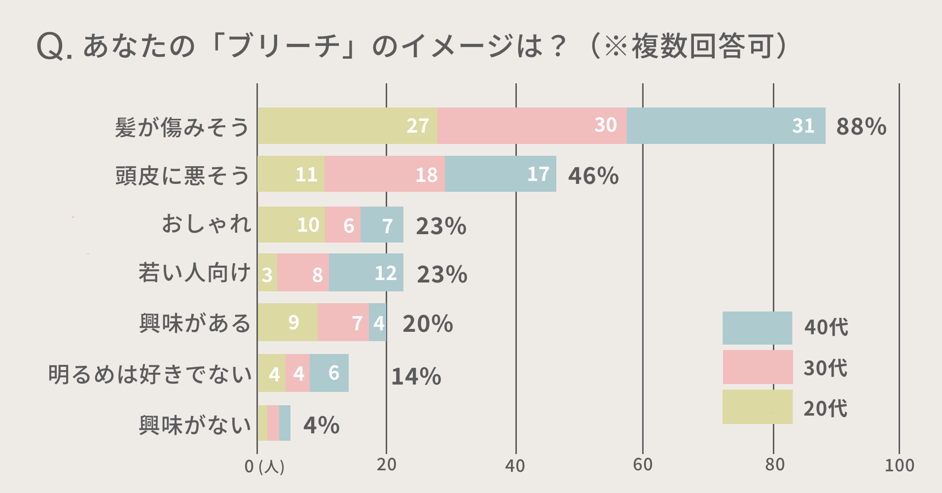 ブリーチをしたことがない20~40代女性に「あなたの“ブリーチ”のイメージは?」とお尋ねしたところ、やはり年齢が上がるたびに「髪が傷みそう」「頭皮に悪そう」というネガティブなイメージが高い結果となりました。