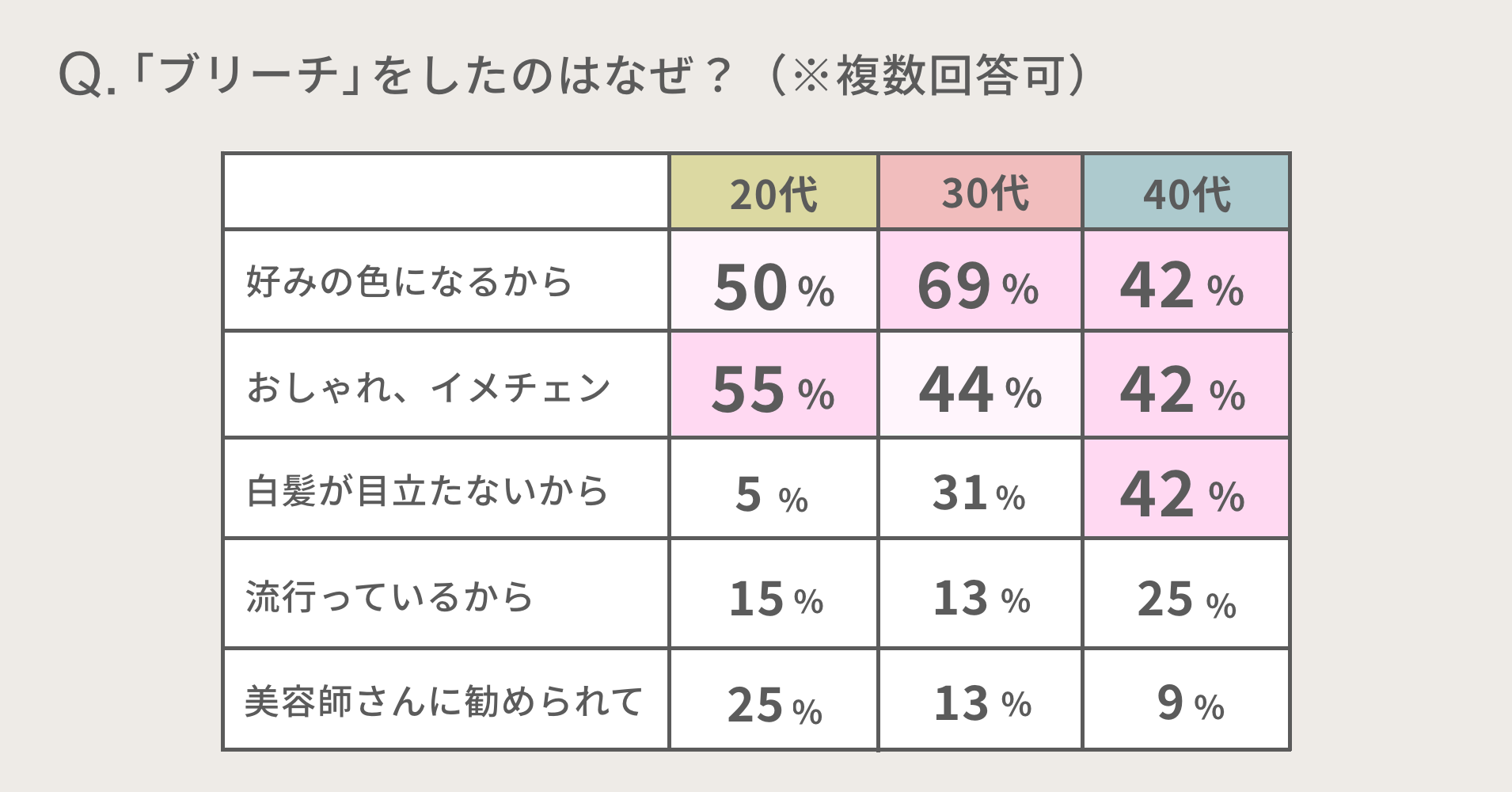 意外と多いのか、そうでないのかはそれぞれの感覚ですが、若者向けのイメージが強いブリーチを現在している30代、40代が共に10%以上というのは決して少なくない割合と言えるでしょう。