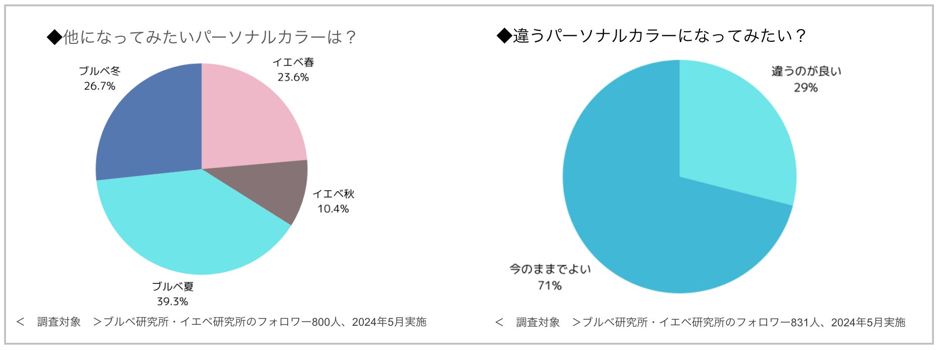 なってみたいパーソナルカラーは、ブルベ夏が一番の39.3%となりました。次いで26.7%「ブルベ冬」、23.6%「イエベ春」、10.4%「イエベ秋」となりました。なお、今のパーソナルカラーと、違うパーソナルカラーになりたい人は、29%となりました。