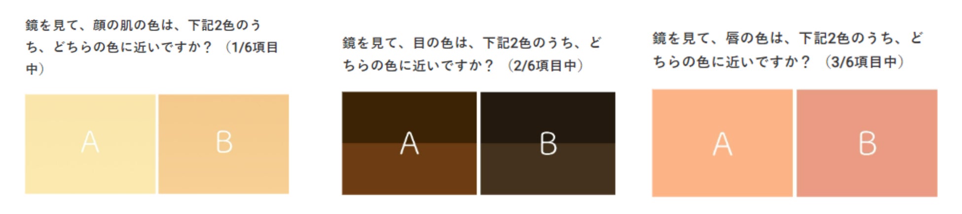 スマホ(又はパソコン)画面に表示された2択のカラーと、(鏡を見て分かる)自分の肌色、唇色、目の色等を比較して、一番近いカラーを選択するだけです。