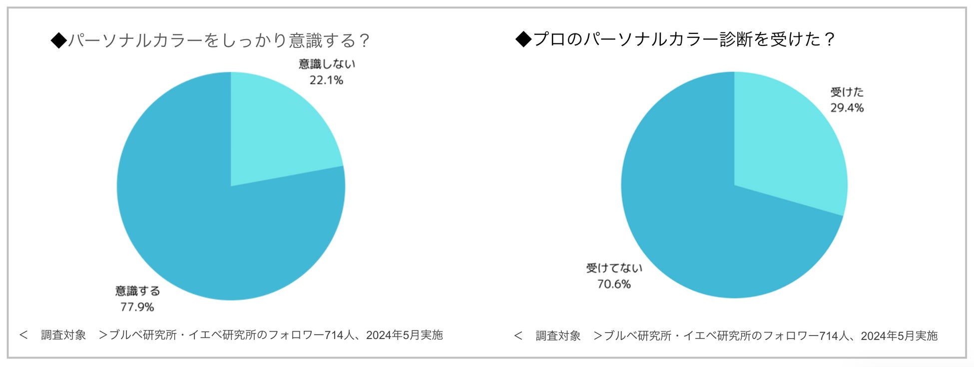 普段ファッションアイテムを購入する際、パーソナルカラーをしっかり意識する人は、77%もいます。そしてプロのパーソナルカラー診断を受けた人は、29.4%と約3割へ。直近、パーソナルカラーに対する意識は向上し続けています。