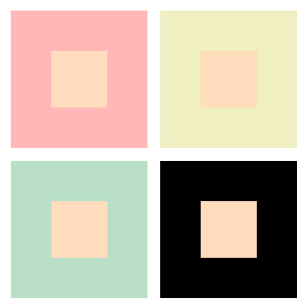 右記4つの四角形の真ん中にある肌色は、すべて同じ色です。この肌色を皆さんの肌色とした時、周りに何色がある時に、一番透明感が出ていますでしょうか。答えは、右下のブラックの中にある肌が一番透明感あるように見えると思います。理由は、この4つの肌色はブルベ冬さんの肌色になっていて、淡い色よりも、ブラックと相性が良い肌色だからです。