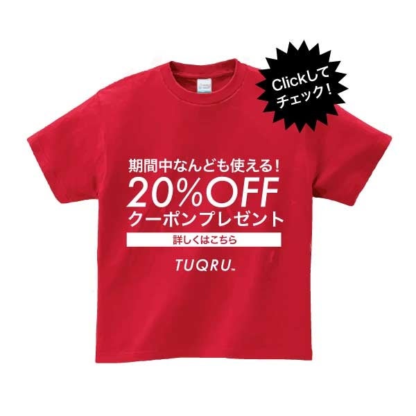 TUQRUでは只今、期間中なんども使える『20%OFFクーポン』プレゼント実施中です! 10枚以上ご購入のご検討の方にはお得なクーポンです。 ぜひこの機会にTUQRUのTシャツ作りをお楽しみ下さい。