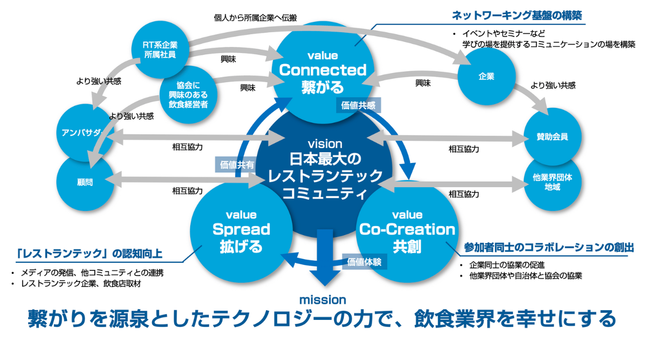「テクノロジーの力で、飲食業界を幸せにする」をミッションに、テクノロジー企業を中心とした賛助会員の皆様をはじめ、業界企業や団体の皆様と共に、数多くのイベントやコミュニティ運営を通じて、飲食DXの普及活動を行なっております。