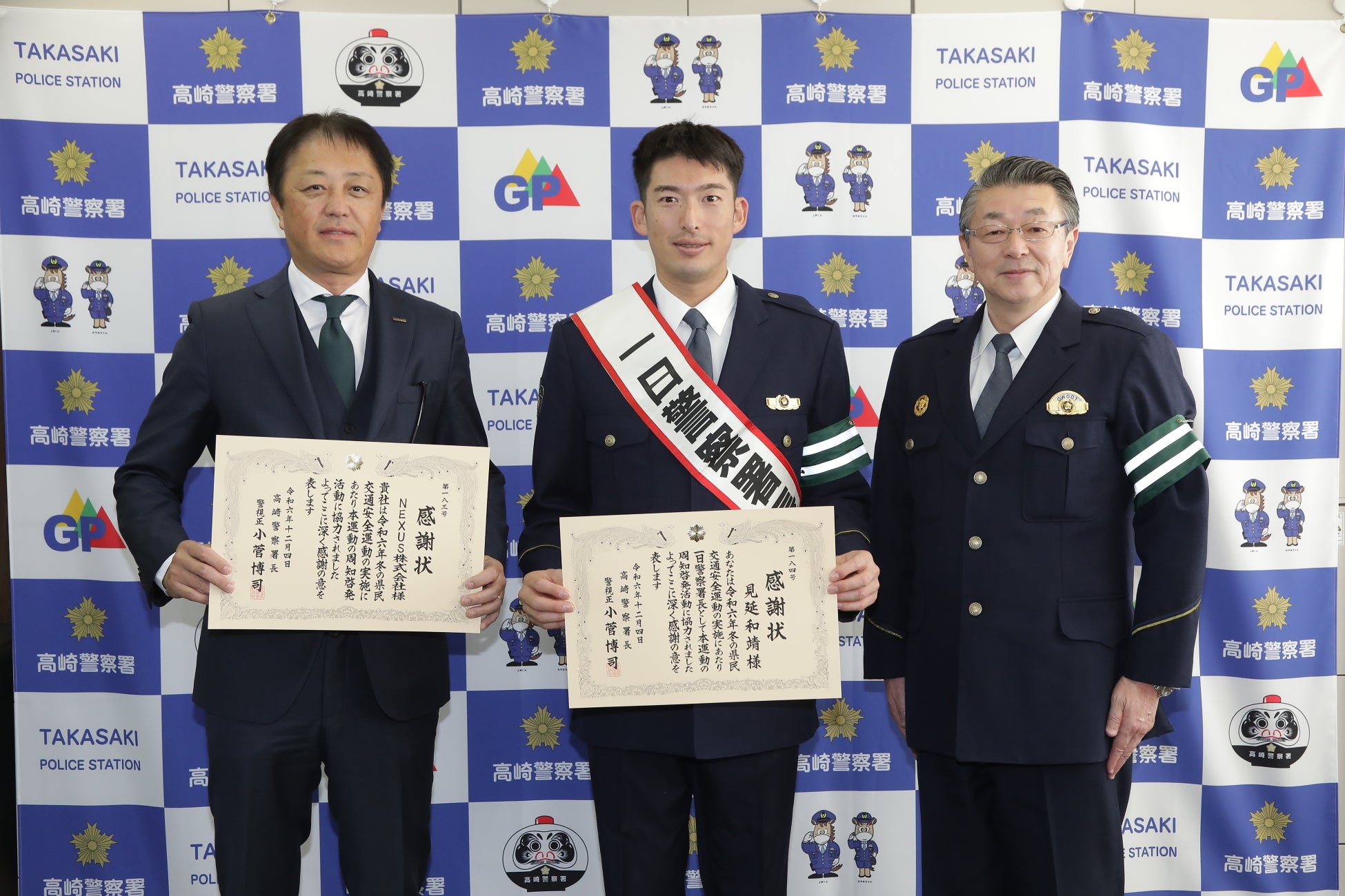 また冬の県民交通安全運動への協力に対して、高崎警察署 警視正 小菅博司署長より、見延和靖選手とNEXUS株式会社 取締役社長 星野正史へ感謝状が授与されました。NEXUSグループでは、継続した交通安全の啓発活動へ協力して参ります。