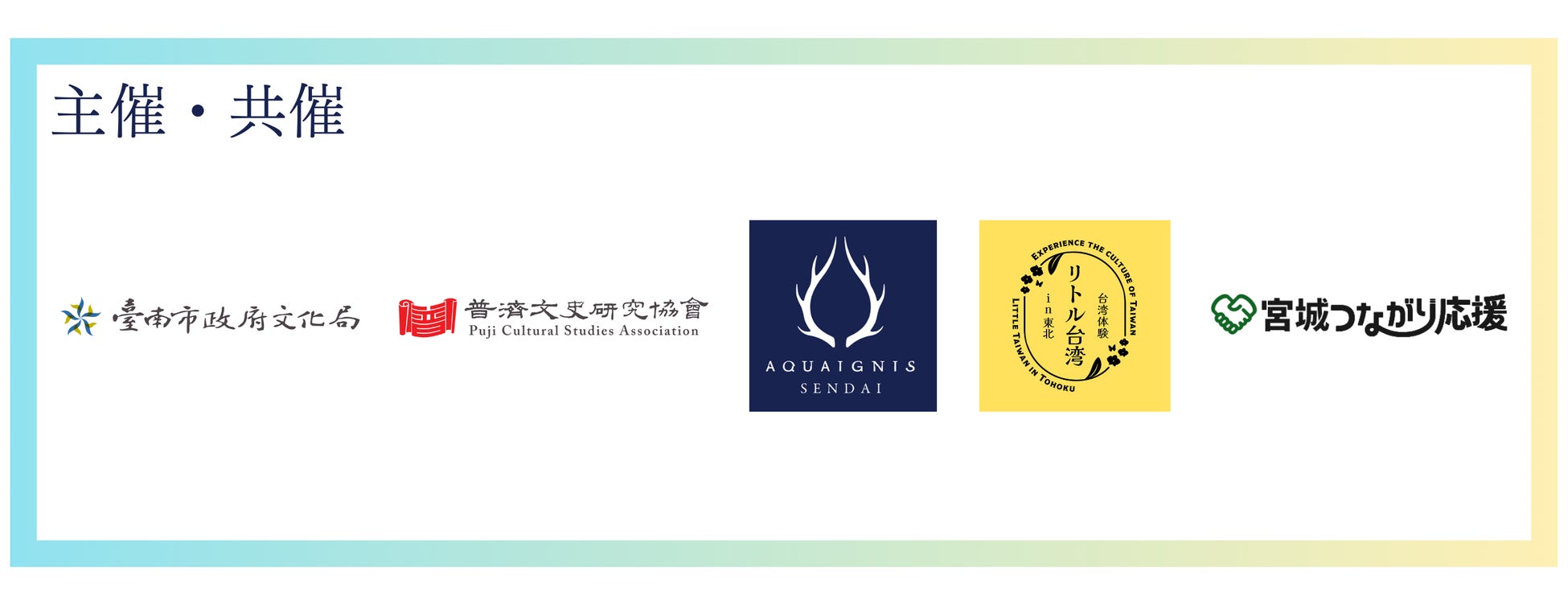 イベントは台南市や宮城に関わる団体「臺南市政府文化局」「普濟文史研究協會」「リトル台湾in東北」「宮城つながり応援」、そして「アクアイグニス仙台」の共催で開催します。