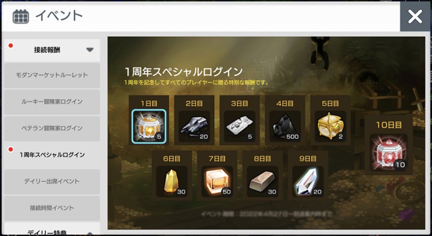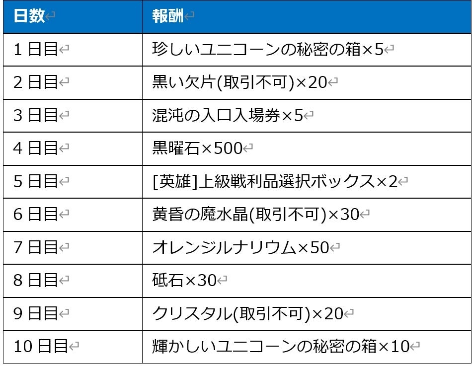 イベント期間中、10日間ログインするだけで黄昏の魔水晶や輝かしいユニコーンの秘密の箱などをプレゼント!