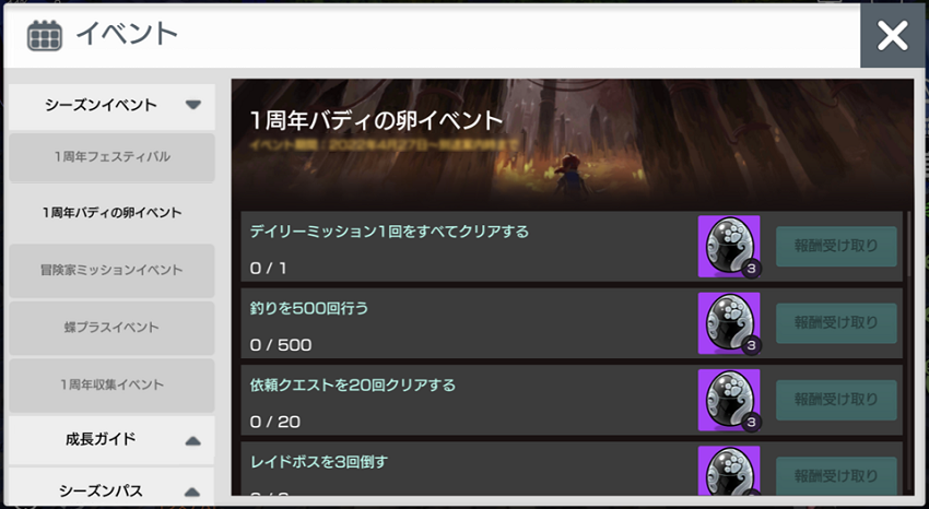 レイドモンスターの討伐や混沌の入口のクリア、ルーンの合成など様々なミッションをクリアすることで「不思議なバディの卵」がなんと!合計100個も手に入る「1周年バディの卵イベント」を開催しました!
