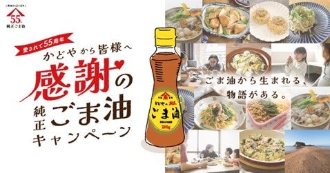 かどやの「純正ごま油」はおかげさまで発売から55周年を迎え「かどやから皆様へ 愛されて55周年感謝の純正ごま油キャンペーン」を開催中。第1弾キャンペーンでは、「純正ごま油」にまつわるご家族・お友達との物語を募集(応募終了)、第2弾では、かどや社員のエピソードに感想を添えてリツイートいただいた中から抽選で55名様に「純正ごま油」が当たるプレゼントキャンペーンを実施しました(応募終了)。