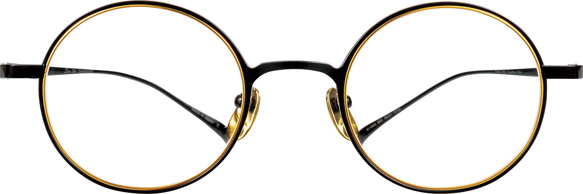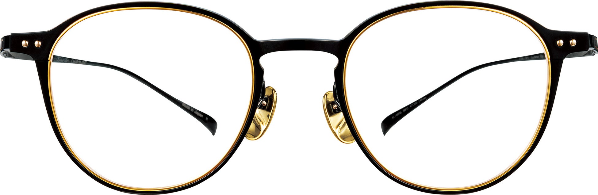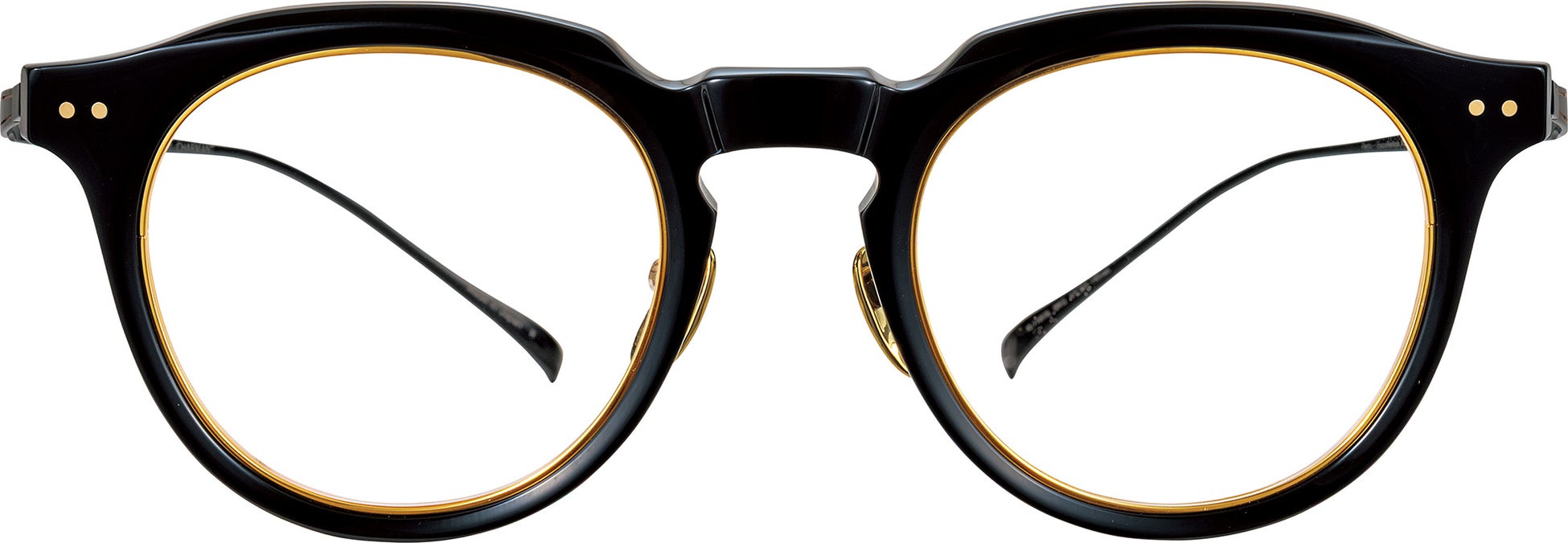 ボリューム感のあるアセテートフロントが印象的なボストン型フレーム。レンズ周囲や上面のカッティングが立体的な表情を生み出します。漆黒の生地とゴールド色のインナーリムとのコントラストが映える逸品です。