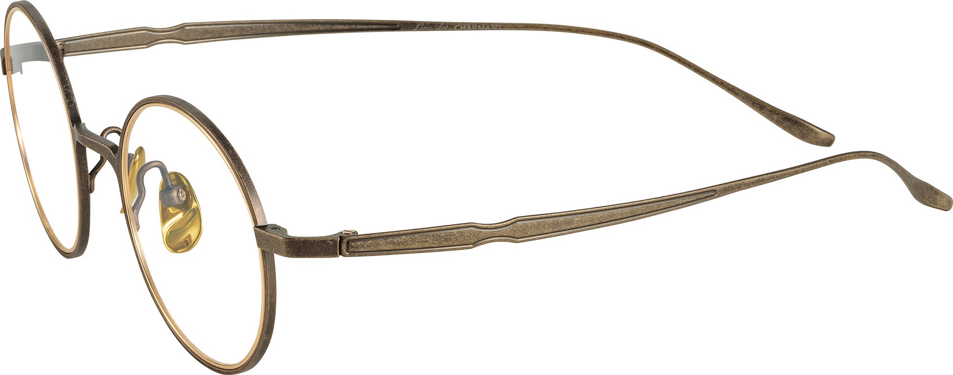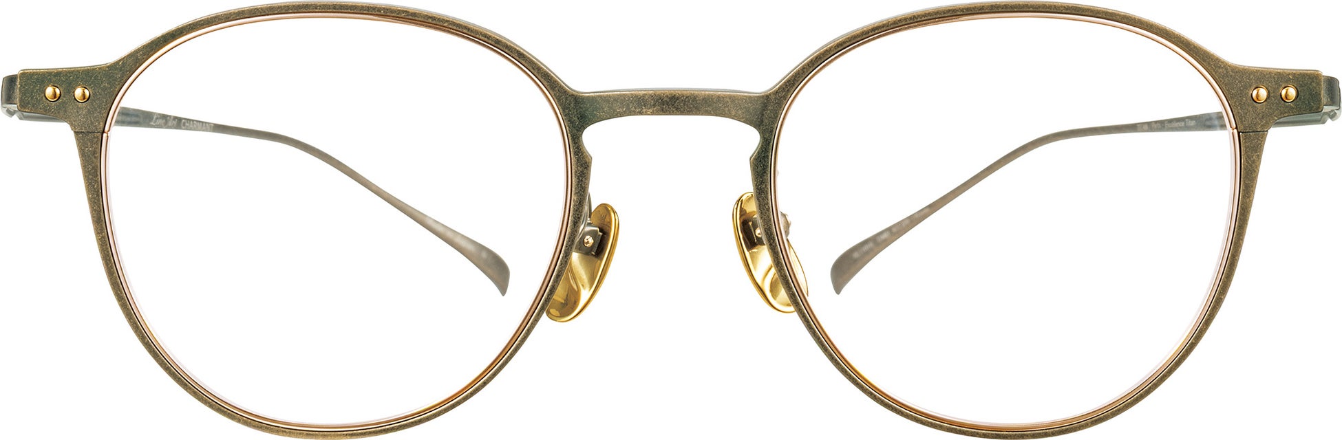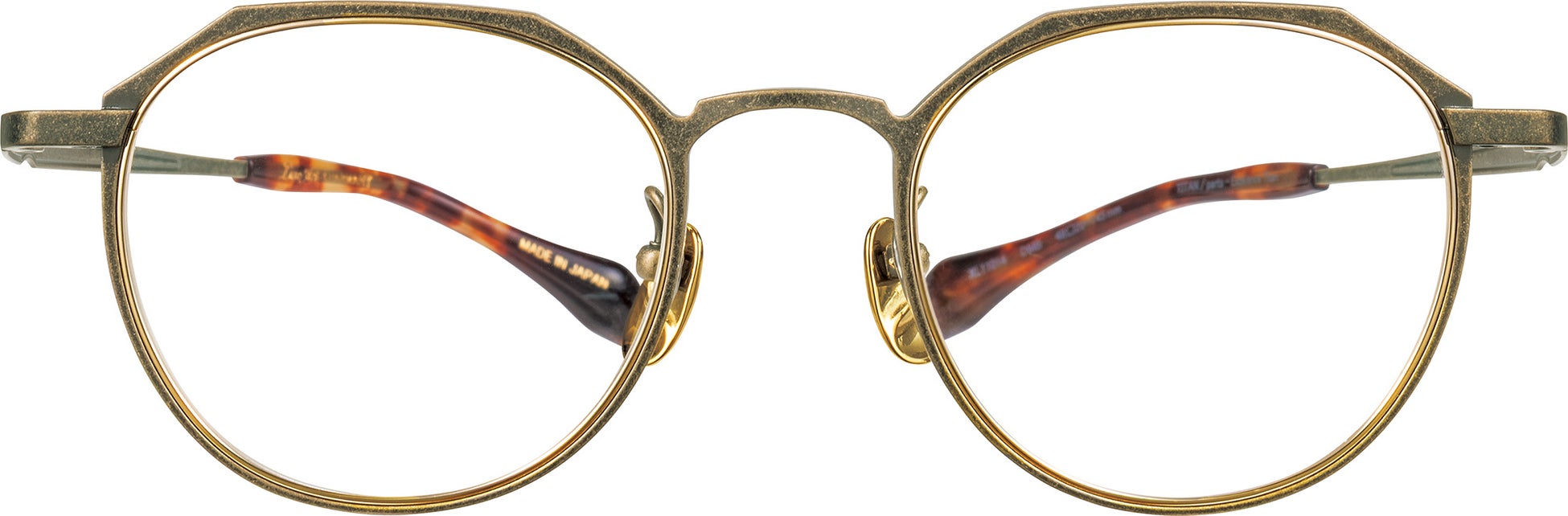 圧延シートメタルを使用した細身のフロントにインナーリムを組み合わせたラウンド型フレーム。アンティーク感のある自然なダメージの風合いにゴールド色のインナーリムがさりげない高級感を演出します。