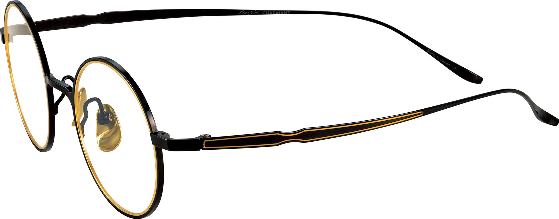 圧延シートメタルを使用した細身のフロントにインナーリムを組み合わせたラウンド型フレーム。一本一本切削で溝加工を施したテンプルには金色のラインが配され、ラグジュアリーなムードが一層際立ちます。