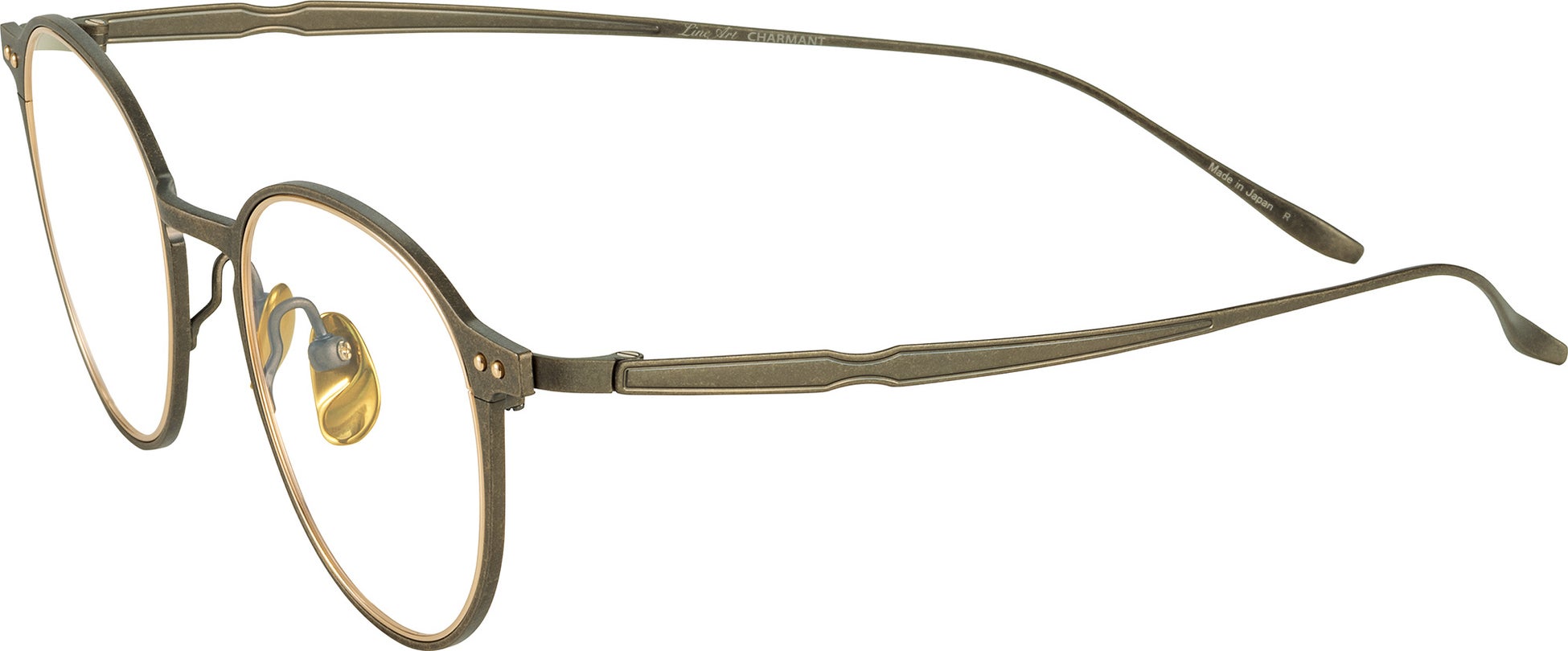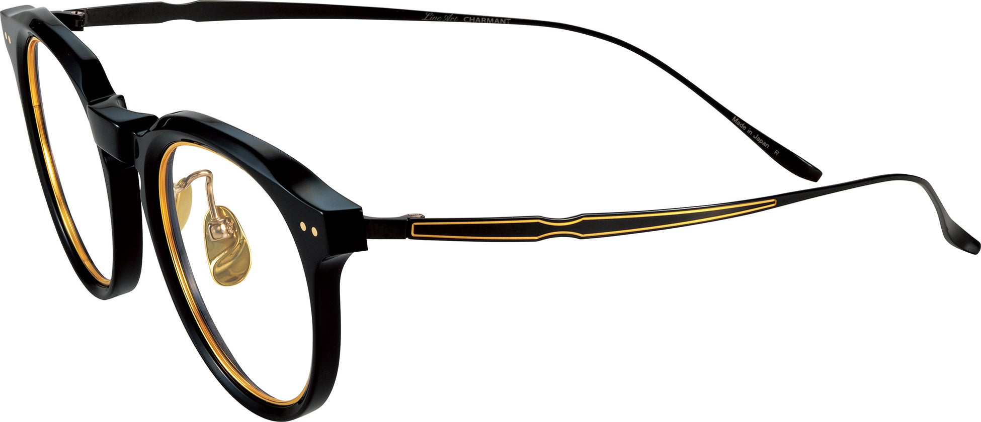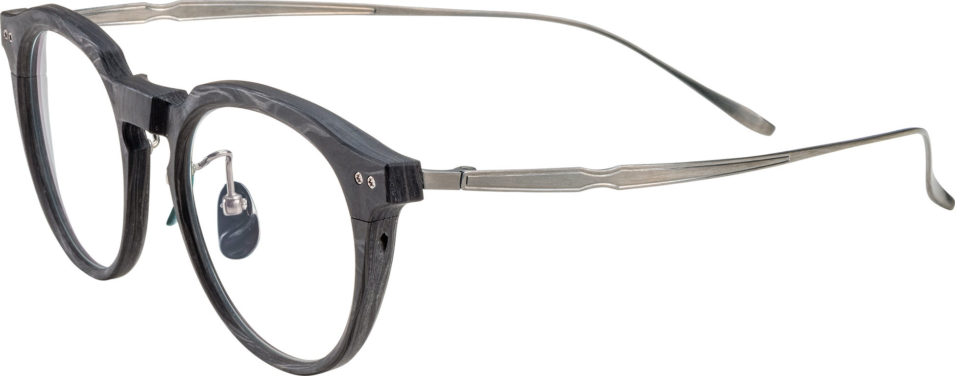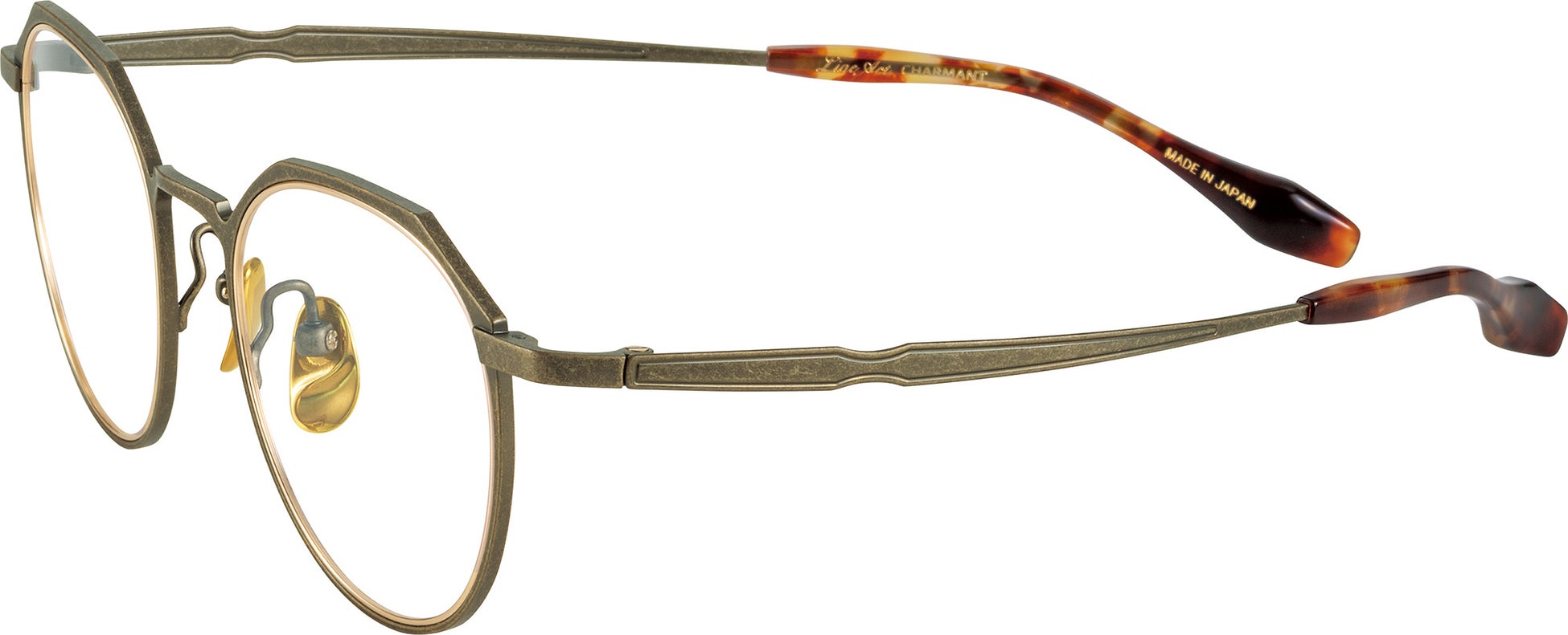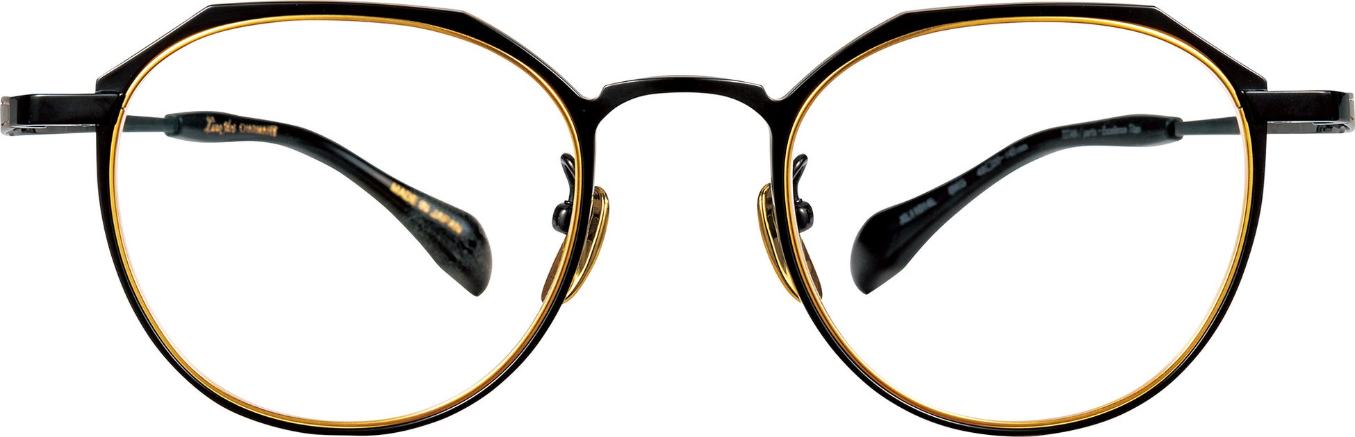 圧延シートメタルを使用した細身のフロントにインナーリムを組み合わせたボストン型フレーム。一本一本切削で溝加工を施したテンプルには金色のラインが配され、ラグジュアリーなムードが一層際立ちます。