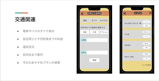 - ダイヤの表示や目的地までの案内、おすすめプランの提案する交通関連機能