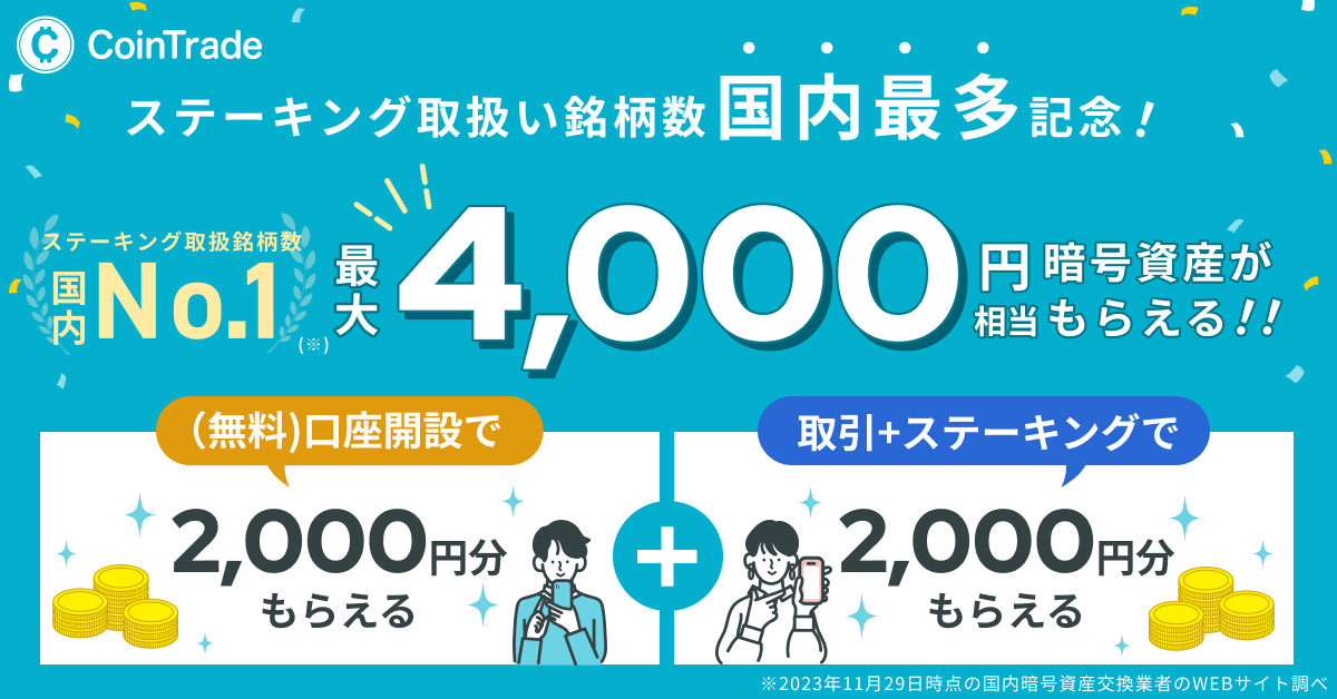また、「CoinTrade(コイントレード)」はアバランチ(AVAX)ステーキングサービス開始を記念して、条件達成者全員に最大4,000円相当の暗号資産をプレゼントするキャンペーンを開催いたします。