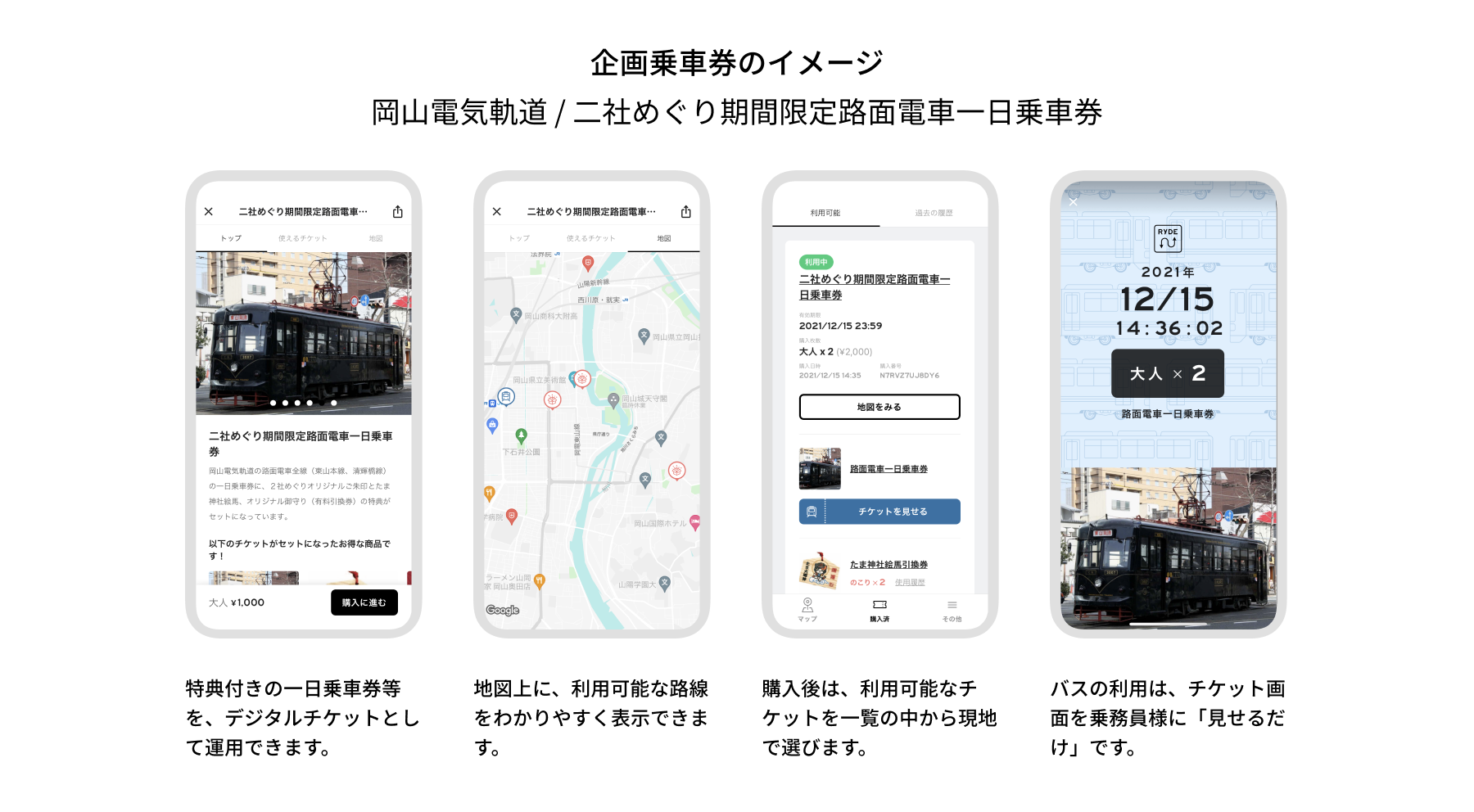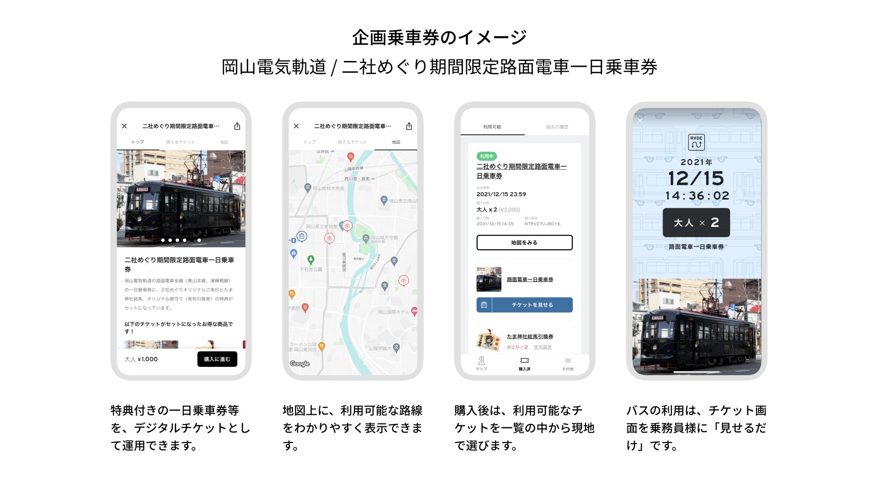 二次交通のDXを推進するRYDE株式会社(本社:東京都渋谷区、代表取締役 杉崎正哉、以下「RYDE」)と岡山電機軌道株式会社(本社:岡山県岡山市、代表取締役社長:小嶋光信)は提携を開始しました。RYDEが提供するモビリティプラットフォーム「RYDEPASS」上で12月28日(火)より同社初のデジタル乗車券「御朱印拝受面付き 二社めぐり路面電車1日乗車券」の販売を行います。「RYDEPASS」の導入によって、キャッシュレス決済による業務の効率化を実現し、データ等を活用したプロモーション施策を行うことが可能になることで、県内外のお客様の利用促進にも繋げてまいります。