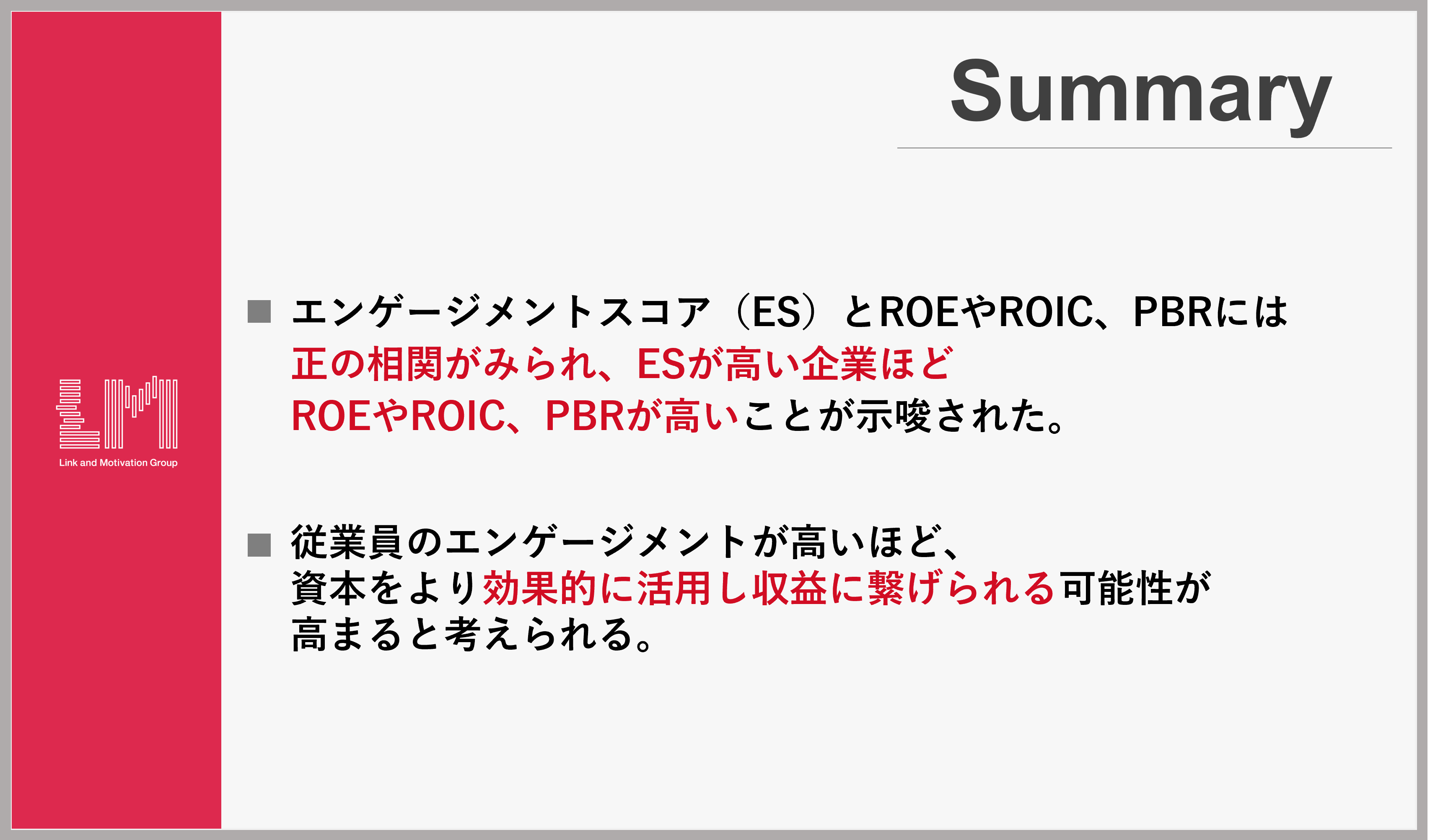 加えて、ROEとROIC双方への影響が顕著にデータとして顕在化していることに、より大きな意味があると捉えています。ROEは純資産のコントロールにより一定の向上が可能であるため、従業員エンゲージメントの影響範囲は狭小ではないかという意見もありますが、従業員エンゲージメントがROEの計算式の分子である純利益を構成するトップラインや支出に対して、間接的に影響を及ぼすであろうことは理解しやすいでしょう。また、比較的操作が難しいROICにおいても正の相関が顕在化したというデータからは、従業員エンゲージメントが、トップラインや販売管理費に比較的大きな影響を及ぼす一因となっている可能性が高いことが読み取れます。両指標への相関性が顕在化したことで、企業の将来性を予測する際に従業員エンゲージメントが新しく有効な示唆となるといえるでしょう。