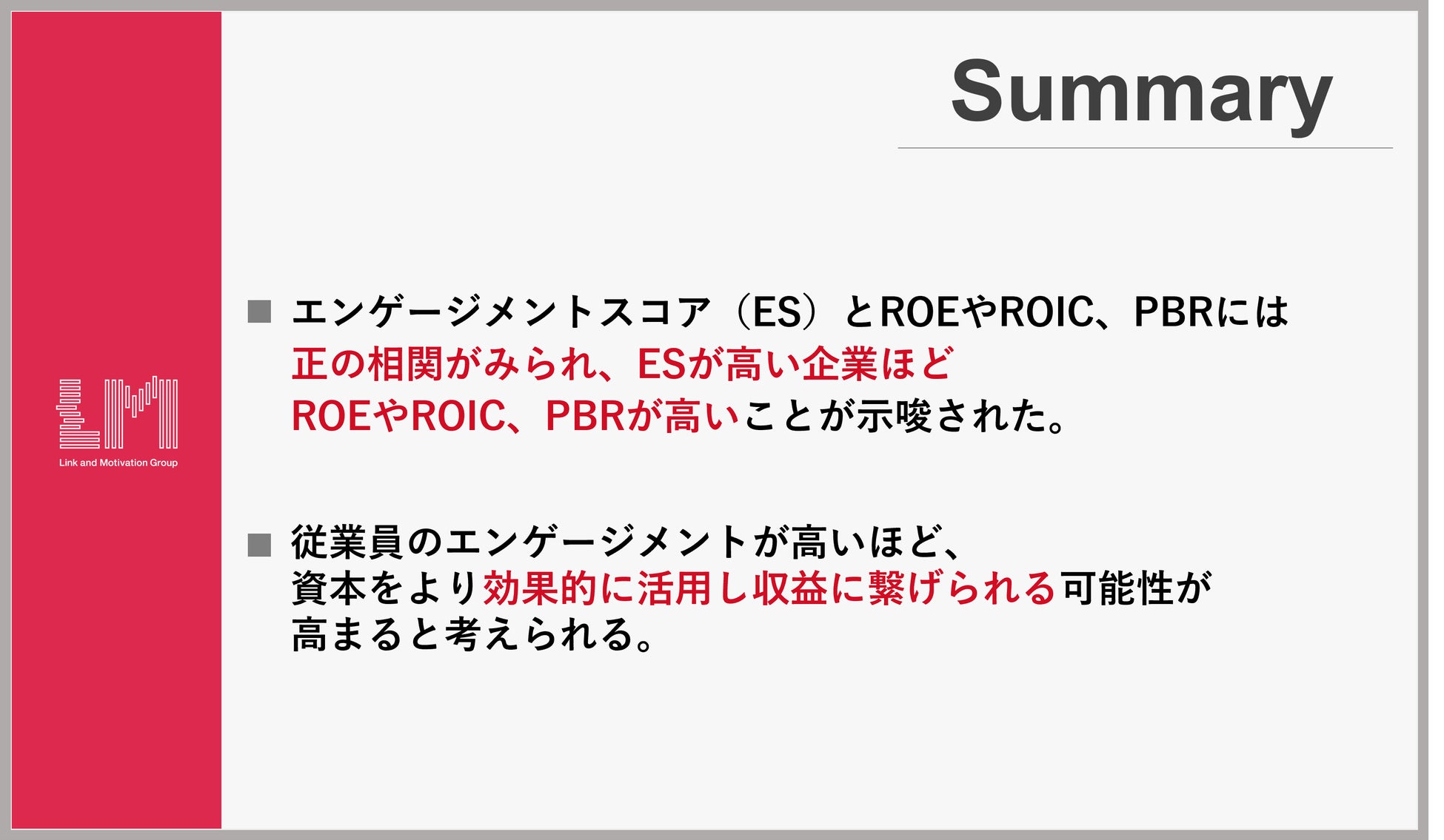 ・ESとROEやROIC、PBRには正の相関がみられ、