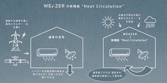 しかし、『WEAZER』は完全オフグリッド。つまり、外部から電気やガスを買ってくるのではなく、太陽光や雨水などから自らエネルギーを生み出し、その場で消費する「地産地消型」のエネルギー設計が基本です。ARTHが開発した「Heat Circulation」は、地産地消のエネルギー設計だからこそ有効な、「これまで利用されていなかった熱」に着目した新しいエネルギー循環の仕組みです。生活する中で発生するシャワーやお風呂などの温排水、あるいは空調や暖炉などの排気から熱を回収し、暖房や冷房・給湯などの熱源として再利用することを可能とします。通常の建物ではただ捨てられてしまう熱をもう一度使うことで電力消費を大幅に削減し、通常の住宅に比べて約3倍の省エネ性能を目指すことができます。自動車で言えばハイブリッド車と同じ概念のこの熱循環技術により、オフグリッドでありながらもサウナといった高エネルギー消費の設備も搭載可能になりました。限られたエネルギーを最大限に活かす、オフグリッドの未来を示す革新的な取り組みです。