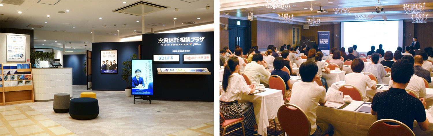 投資信託相談プラザは、来店型の資産運用の相談専門店です。富山・東京・大阪・名古屋など全国に展開しております。店舗では、弊社に在籍する独立系ファイナンシャル・アドバイザー「IFA」が、中立の立場で証券会社選びから、NISAやiDeCo(個人型確定拠出年金)などの各種制度の活用アドバイスをはじめ、お客様一人一人に合った資産運用を相談料無料でサポートいたします。ネット証券のSBI証券、楽天証券などと提携しており、各社の幅広い商品ラインナップを駆使したご提案も可能です。