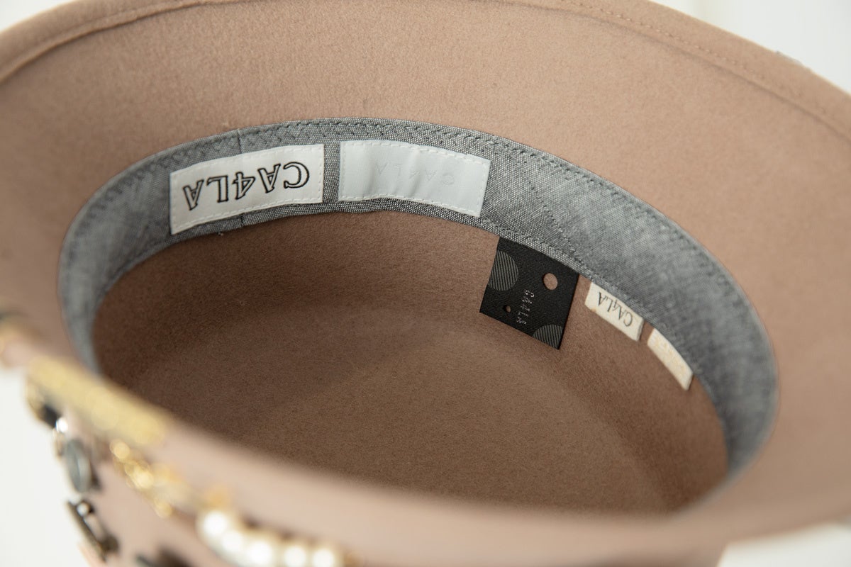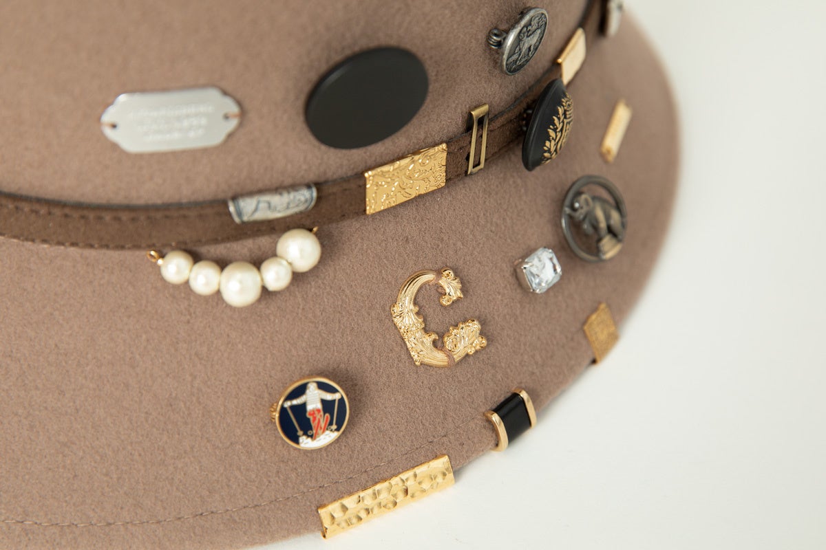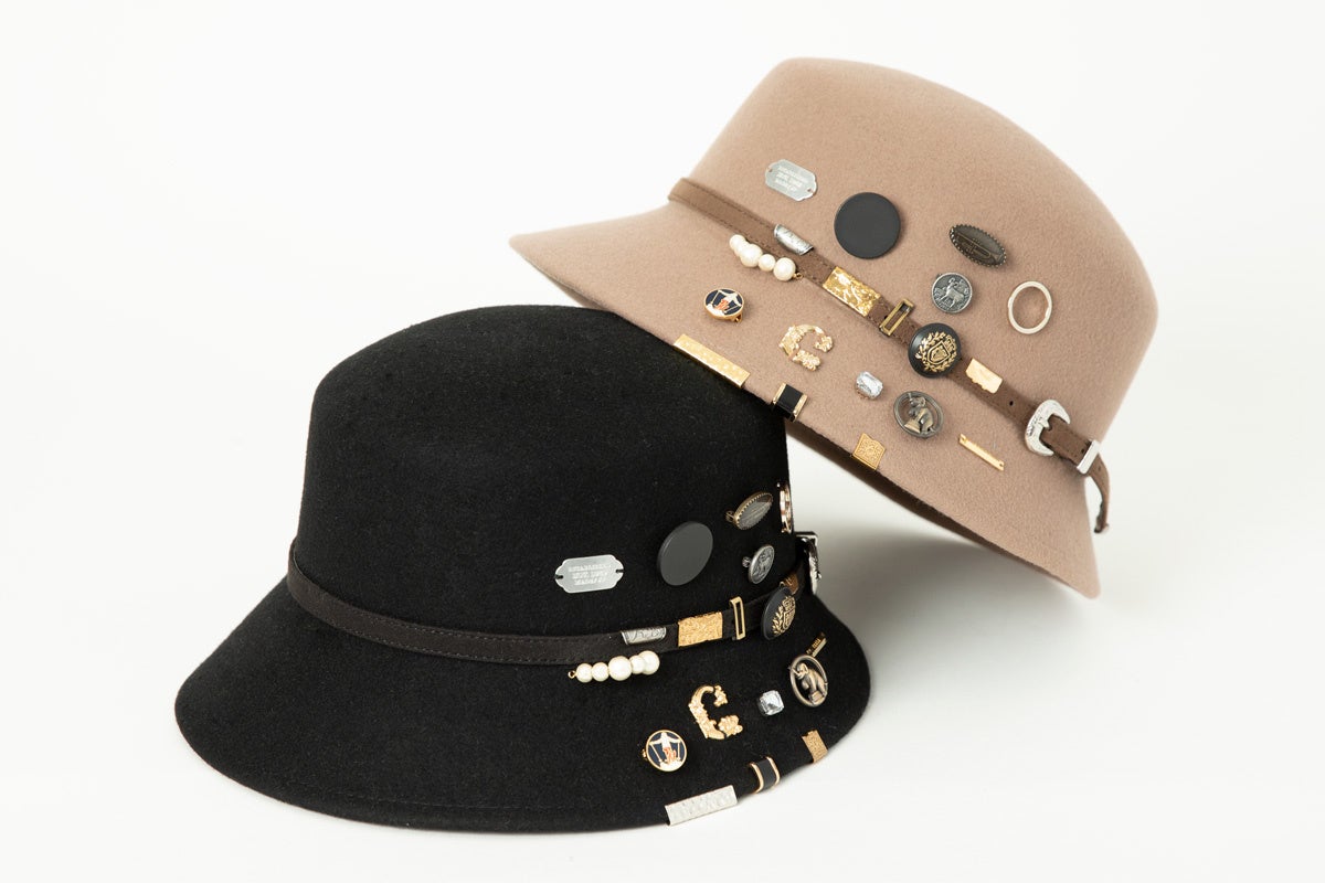 ウィメンズデザイナーたちのコラボレーションによるフェルトハットは、歴代のデザイナーたちが使用してきた装飾パーツやネームタグを膨大なアーカイブから選定して、25周年にちなんで25種類を贅沢にデコレーション。