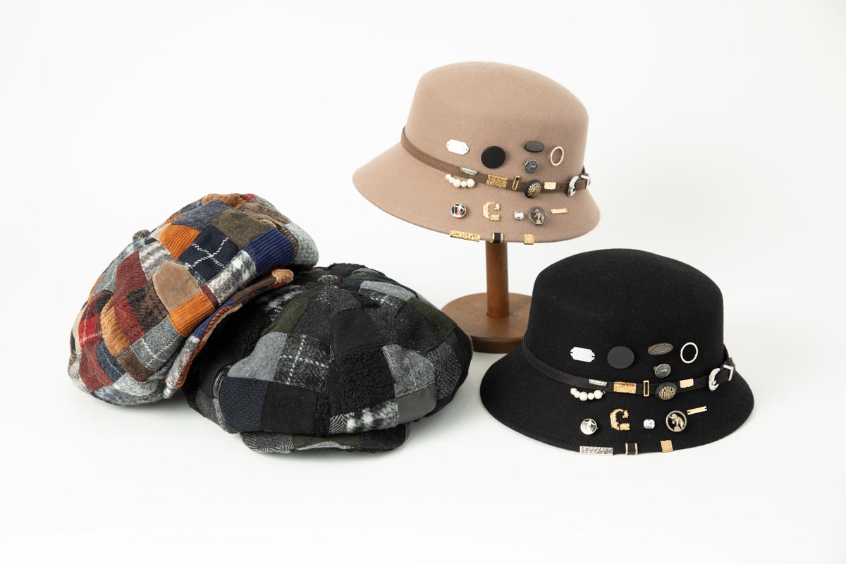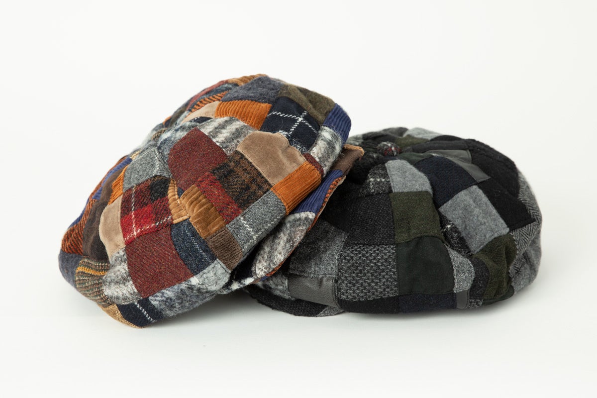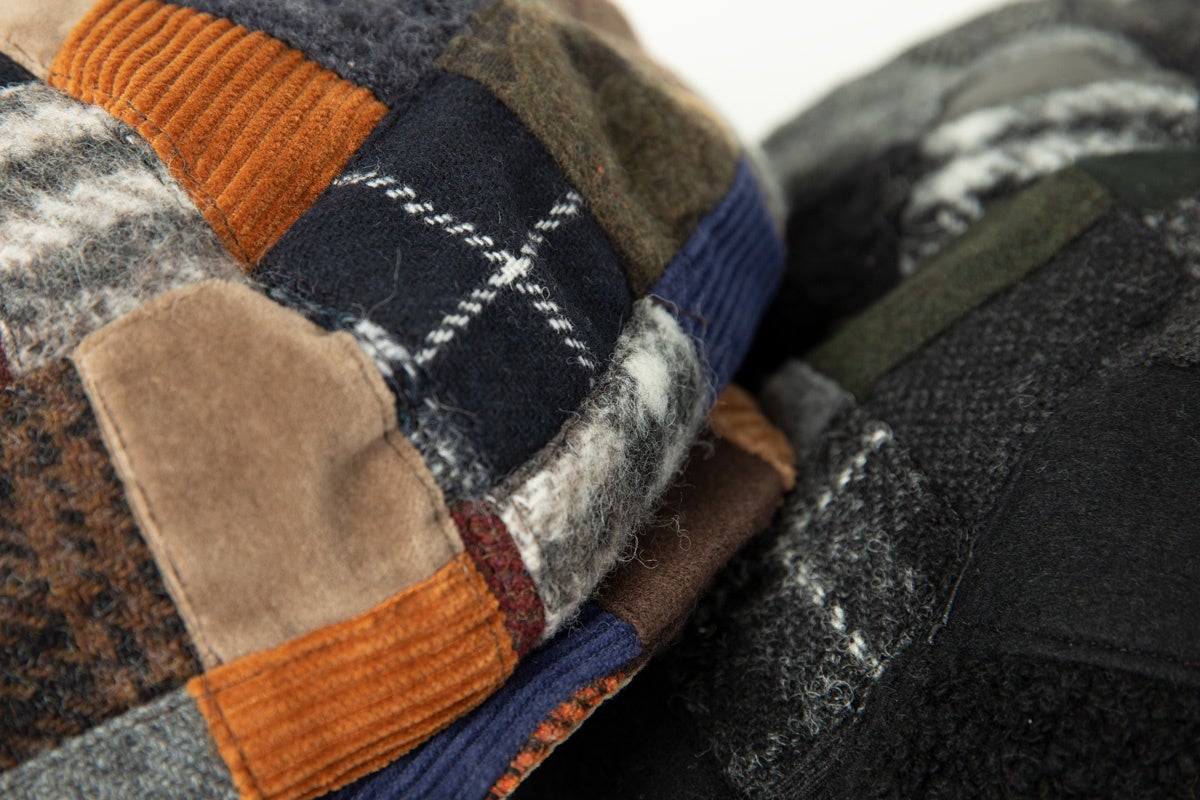 メンズデザイナーたちのコラボレーションによるビッグシルエットのキャスケットは、柄も大きさもバラバラな残布をひとつずつ丁寧に裁断して、細かなパターンのパッチワーク生地を作り、そこから帽子に仕立てています。